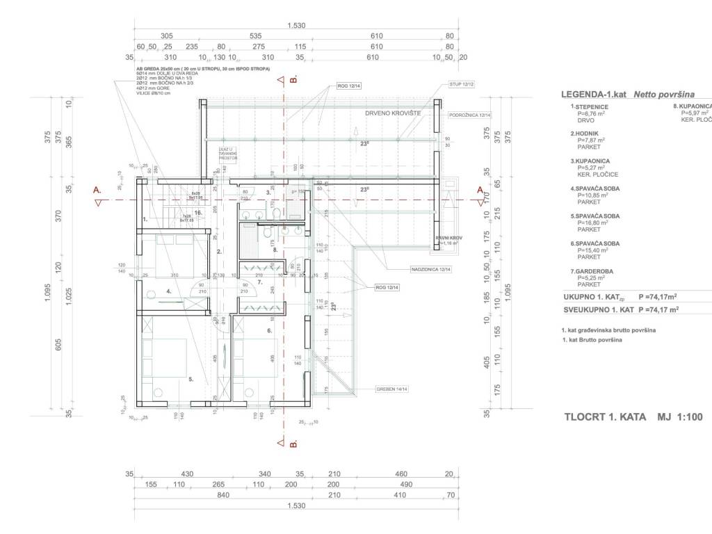 1.KAT: na prvome katu se nalaze tri spavaće sobe i dvije kupaonice.