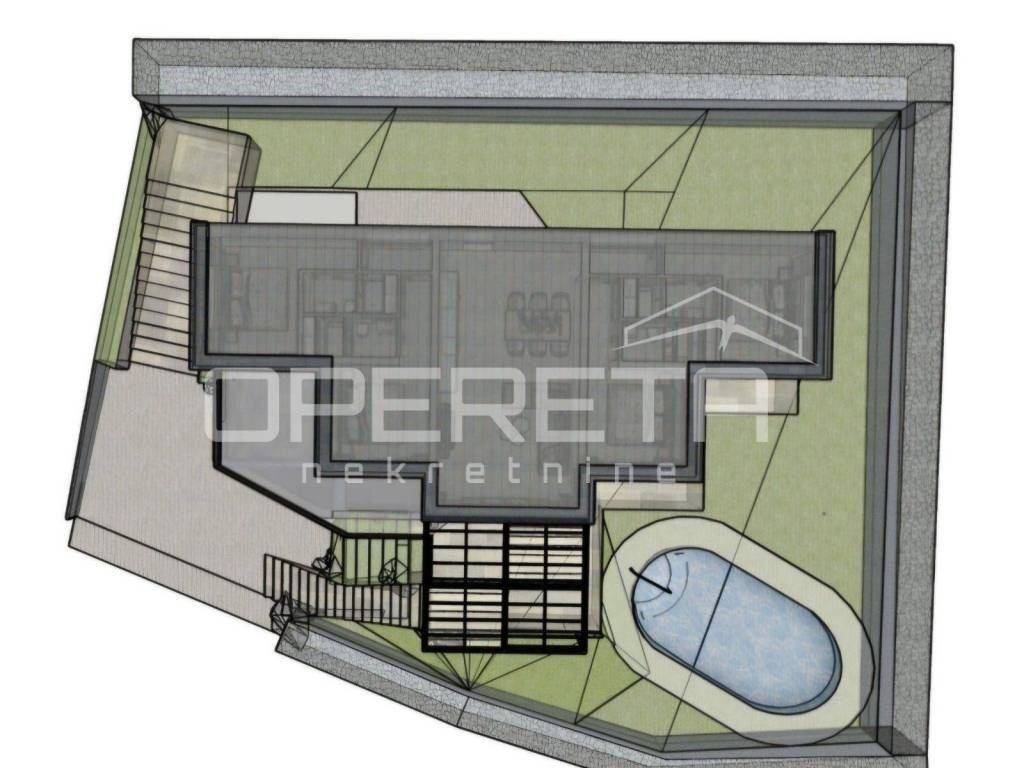 Das Flachdach bietet die Möglichkeit, eine großzügige Dachterrasse mit Meerblick zu gestalten. Das Grundstück ist im mediterranen Stil angelegt, mit Trockenmauern, Olivenbäumen und aromatischen Kräutern, im Zentrum befindet sich ein ovaler Pool mit Natursteinpflaster.