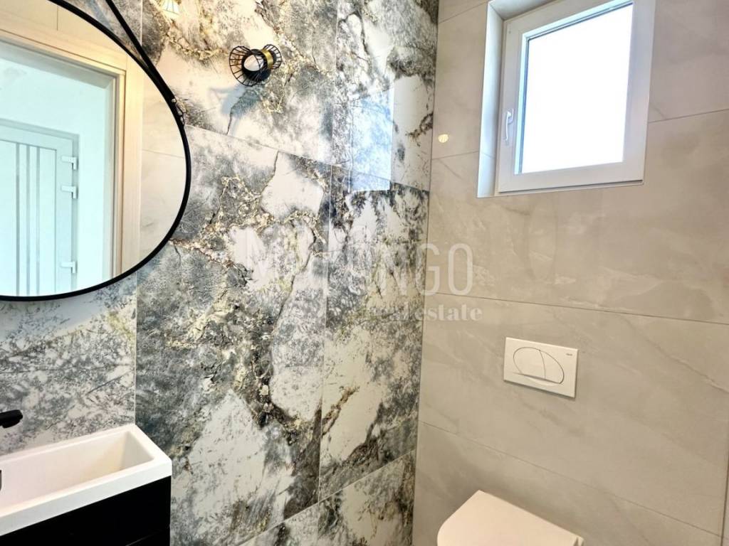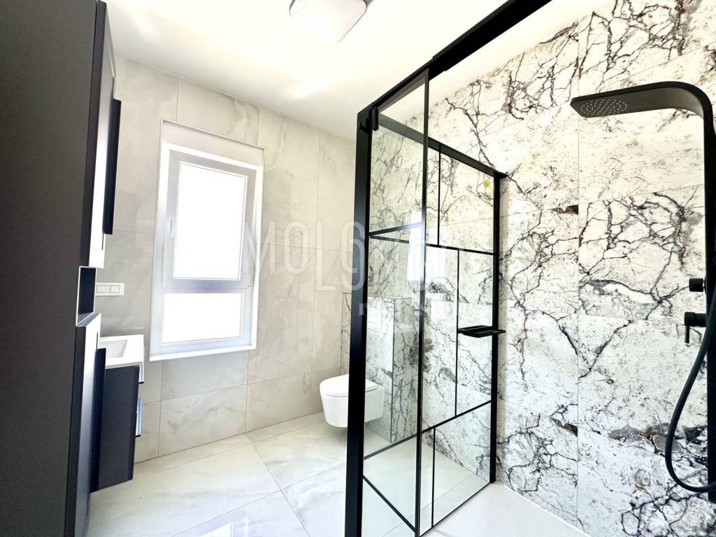 An einem attraktiven und einzigartigen Standort in Kornić, in unmittelbarer Nähe zur Stadt Krk, befindet sich diese freistehende, modern gestaltete Villa mit beeindruckendem Panoramablick auf das Meer. Diese luxuriöse Immobilie bietet 200 m² Wohnfläche, verteilt auf zwei Etagen, auf einem Grundstück von 614 m².