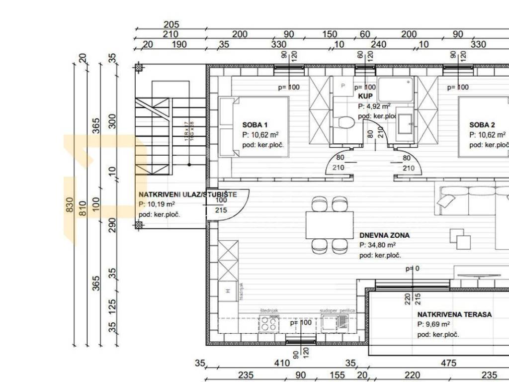 Der Grundriss der Wohnung ist als offener Wohnbereich mit Küche und Esszimmer gestaltet, zwei komfortable Schlafzimmer und ein modernes Badezimmer mit begehbarer Dusche und Fußbodenheizung. Das Wohnzimmer ist klimatisiert und hat direkten Zugang zur Terrasse.