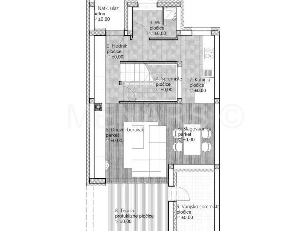 PRIZEMLJE: natkriveni ulaz, hodnik, wc, spremište ispod stubišta, dnevni boravak, blagovaonica, kuhinja, terasa - natkrivena, vanjsko spremište (tlocrt među slikama).