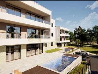 Die Wohnung im ersten Stock hat eine Fläche von 105 m² und besteht aus einem großzügigen Wohnzimmer mit Küche, zwei oder drei Schlafzimmern (je nach Wunsch des Käufers), zwei Bädern und einer überdachten Loggia von 20 m², die ganzjährig genutzt werden kann. Zu jeder Wohnung gehören zwei Außenstellplätze und ein kleiner Abstellraum.
