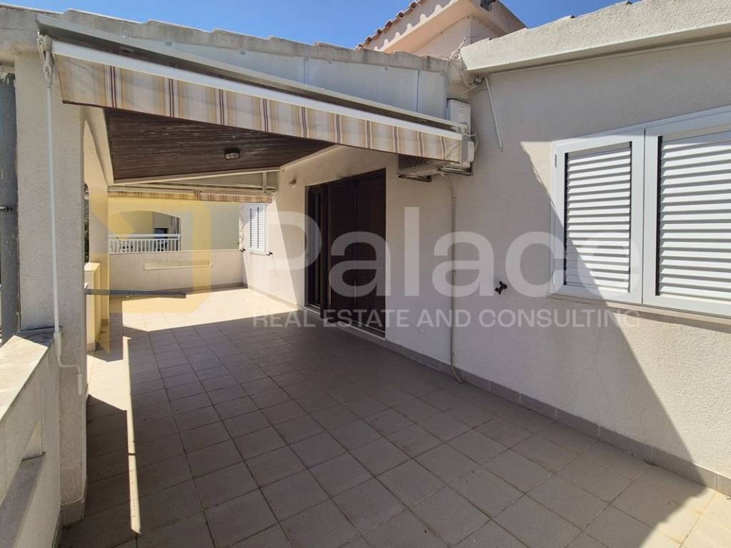 Eine Außentreppe führt zur zweiten Etage, bestehend aus einer geräumigen überdachten Terrasse, zwei Schlafzimmern, von denen eines direkten Zugang zum Badezimmer hat, einer Küche mit Essbereich und einem Wohnzimmer.