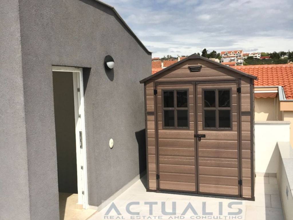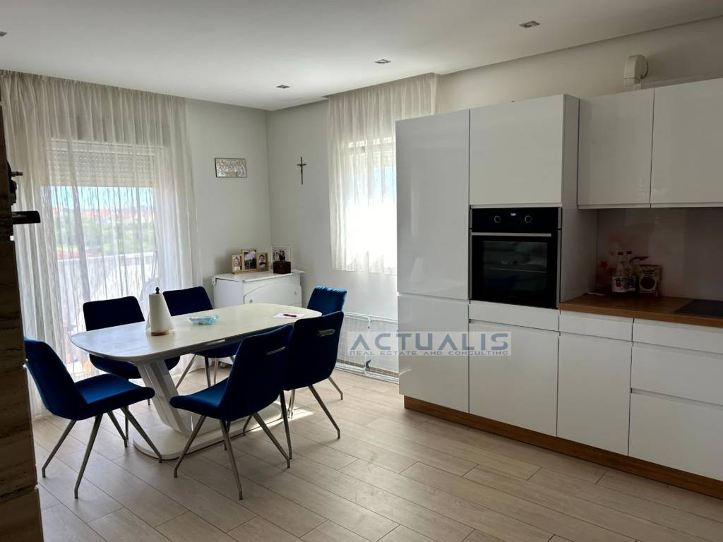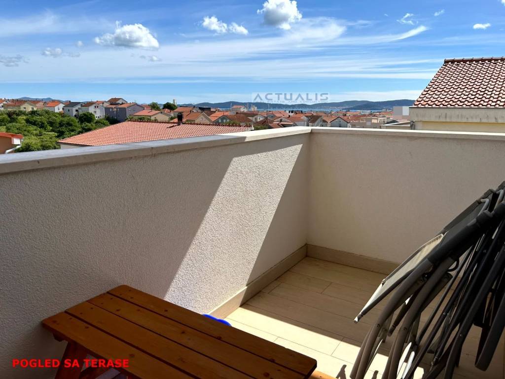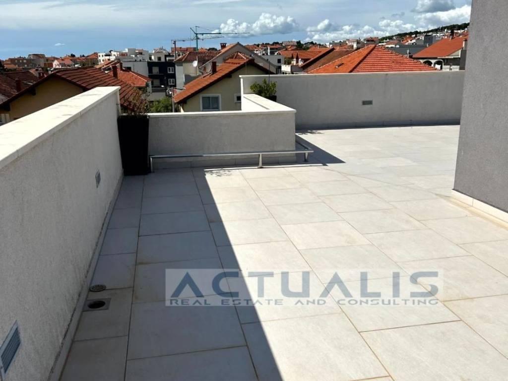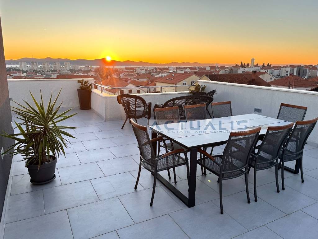 Prodaje se trosobni komforni stan (PENTHOUSE) u Zadru površine 88 m2 (118 m2 sa pripadcima) koji se sastoji od: predsoblja, ulaza, kuhinje i blagovaonice, dnevnog boravka, tri spavaće sobe, dvije kupaonice i natkrivene terase. Stanu pripada na krovu zgrade: stubište i nenatkrivena terasa površine 80,00 m2 sa koje se pruža odličan panoramski pogled na grad i okolicu. Stan se prodaje potpuno namješeten sa opremom i uređajima. Stanu također pripadaju i dva parkirna mjesta.