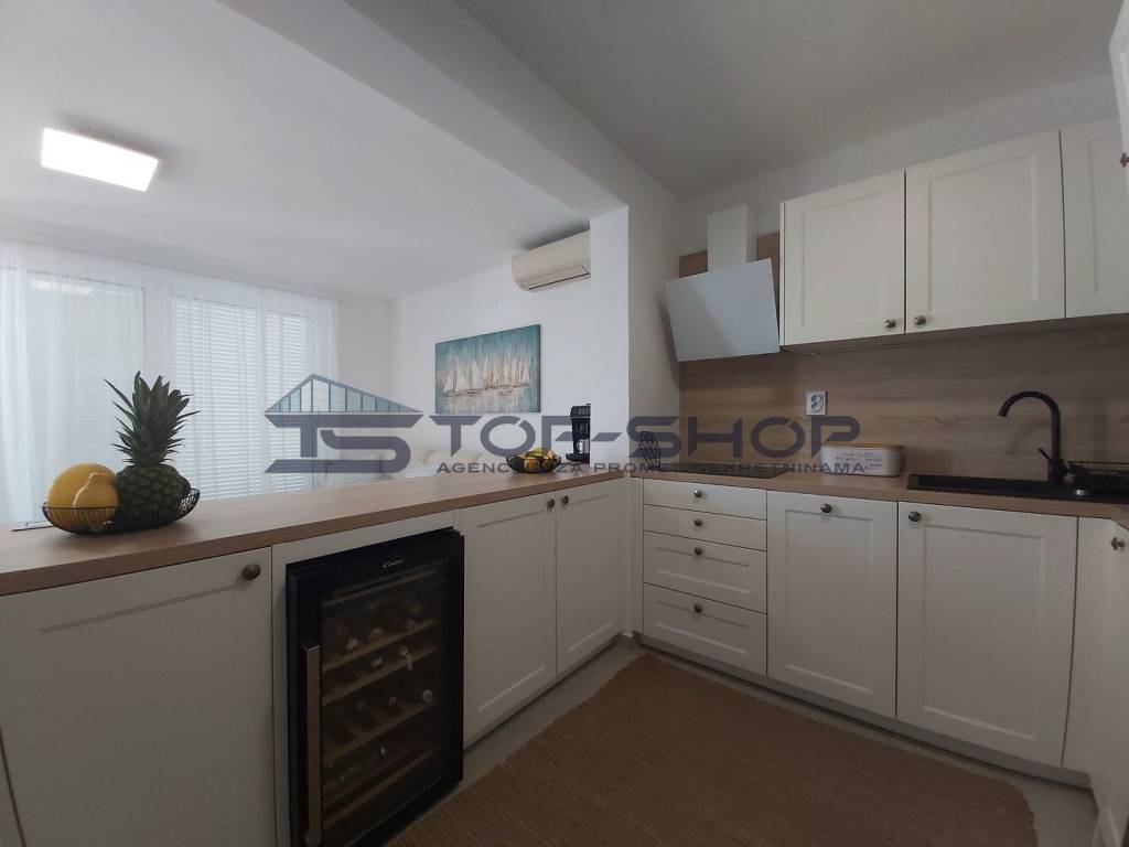 Svaki stan ima poseban ulaz. Stanovi prizemlja i 1. kata povezani su također unutarnjim stubištem, ali ono može biti zatvoreno. U prizemlju se nalazi nedavno renoviran stan koji se sastoji od kuhinje s dnevnim boravkom, kupaonice i dvije spavaće sobe. Na razini ceste nalazi se 3 sobni apartman (1 spavaća soba s bračnim krevetom, 2 s krevetima za jednu osobu), kupaonica, te veliki dnevni boravak s kuhinjom, s izlazom na veliku terasu s pogledom na more. Na drugom katu nalazi se treći stan. Sastoji se od prostranog dnevnog boravka s kuhinjom, izlazom na veliku terasu s prekrasnim otvorenim pogledom na more. Sve sobe su opremljene klima uređajima. Kuhinje kompletno uređene sa svim aparatima uklj. perilice posuđa na svakom katu. Perilica i sušilica rublja nalaze se u spremištu u prizemlju uz terasu.