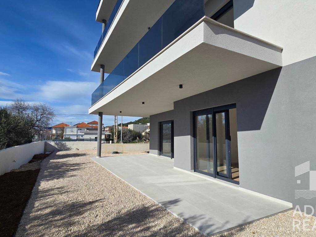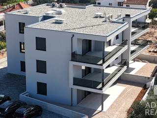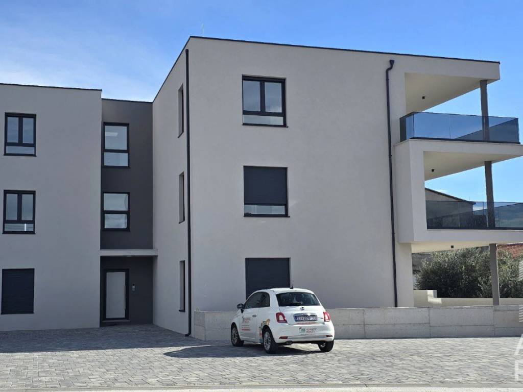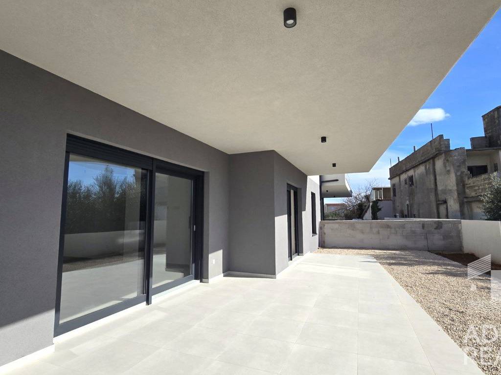 Zum Verkauf steht eine geräumige Wohnung im Erdgeschoss eines modernen Gebäudes mit insgesamt sechs Wohneinheiten in Tribunj. Die Nettofläche des Innenraums beträgt 82,29 m2 und besteht aus einem Eingangsbereich, Flur, Küche, Esszimmer und einem offenen Wohnbereich, der Zugang zu einer überdachten Terrasse mit einer Fläche von 28,66 m2 bietet. Im Rest der Wohnung befinden sich zwei Schlafzimmer, ein Badezimmer, eine zusätzliche Toilette und ein Waschraum.