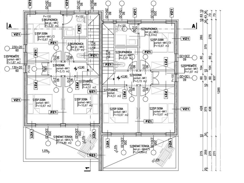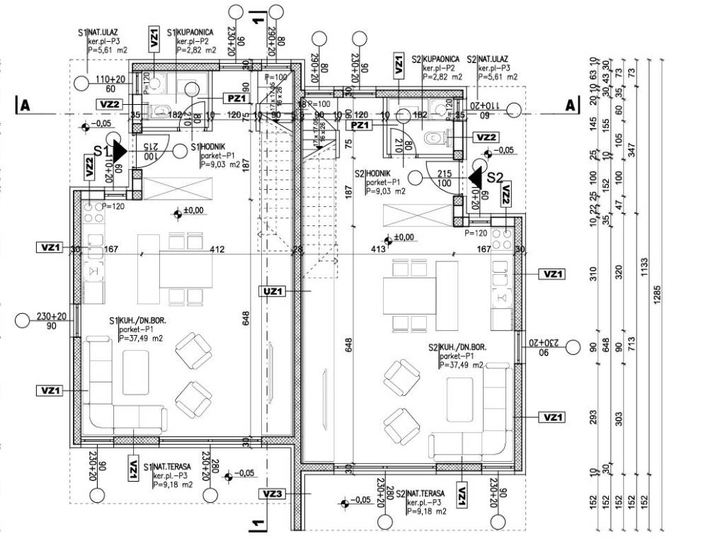 - Prizemlje: Prostrani dnevni dio otvorenog koncepta koji čine kuhinja, blagovaonica i dnevni boravak s izlazom na terasu i vrt, te WC.