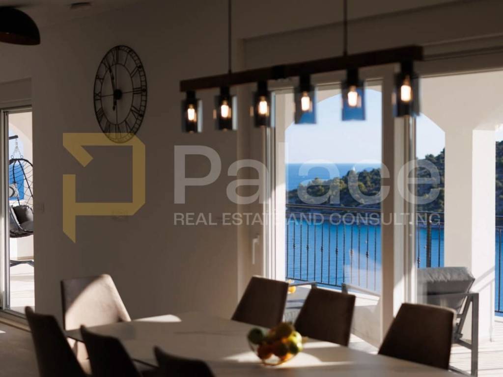 3. Etage - Beeindruckendes offenes Wohnzimmer mit Küche und Essbereich, das zu einer großen Terrasse führt, mit einem herrlichen Blick auf das Meer und die umliegende Bucht.