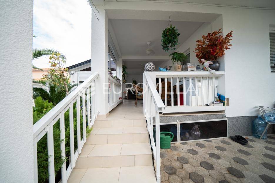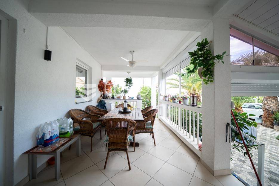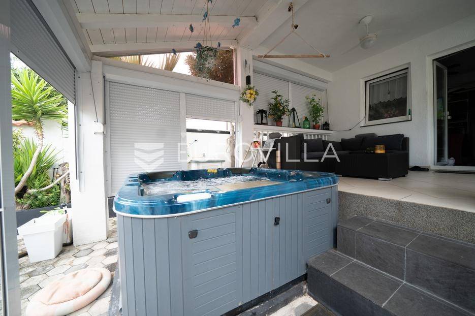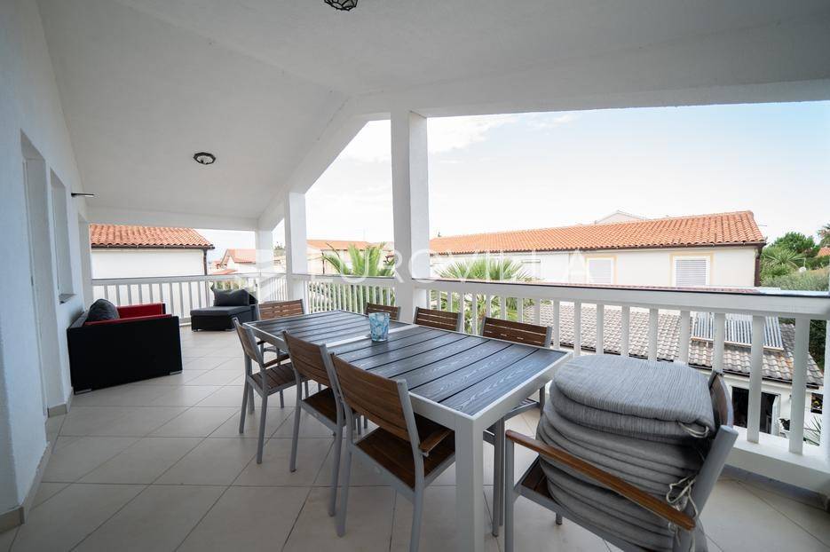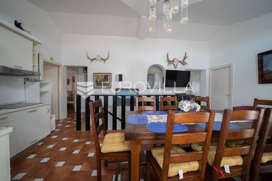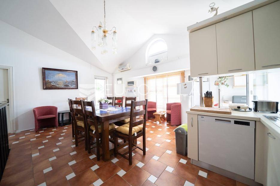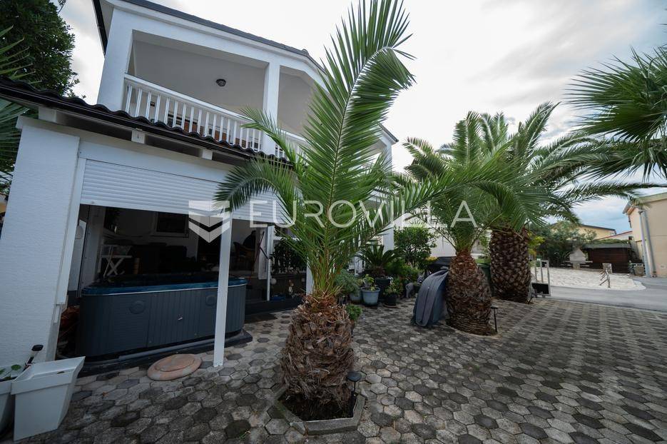 Zadar, Vir, lijepa, prostrana kuća na mirnoj lokaciji na otoku Viru.Sastoji se od dva stana sa komfornim rasporedom prostorija i svim sadržajima potrebnim za svakodnevni život.Stan u prizemlju sastoji se od dvije spavaće sobe, kupaonice, kuhinje, blagovaonice i dnevnog boravka te terase na kojoj se nalazi jacuzzi, idealnoj za opuštanje i uživanje.Unutarnjim stepeništem dolazi se na kat gdje se nalazi stan sa četiri spavaće sobe, dvije kupaonice, kuhinjom, blagovaonicom i dnevnom boravkom te dvije prostrane terase, a s jedne se pruža pogled na more.Kuća je klimatizirana, provedeno je i podno grijanje na vodu u cijeloj kući.Postavljeni su i solarni paneli te dodatno solarno za toplu vodu koje se nalazi u garaži/pomoćnom objektu površine 25 m2. Ovdje se nalazi i dodatna kupaonica.Dvorište je prekrasno uređeno te obiluje zelenilom i mediteranskim drvećem koje stvara poseban ugođajOva nekretnina je savršen spoj komfora i funkcionalnosti, pogodna za korištenje tokom cijele godine ili kao investicija u turizmu.Udeljenost od mora i plaže iznosi svega 70ak metara.Uredno vlasništvo.Stojimo Vam na raspolaganju za više informacija.