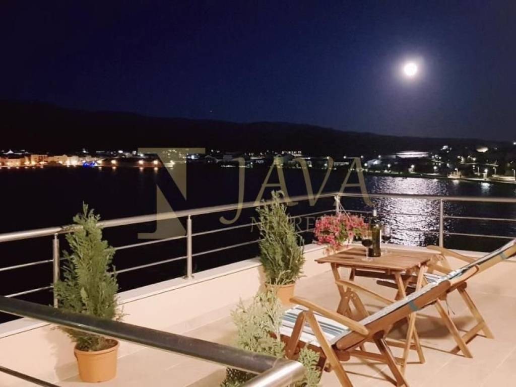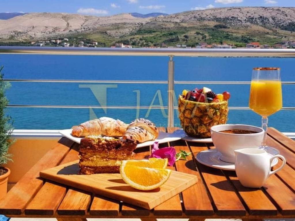 * Na prvom katu je apartman od 75 m2 koji se sastoji od jedne spavaće sobe, dnevnog boravka-kuhinje blagovaone, kupaonice i balkona koji se proteže na tri strane ville i s kojeg puca impresivan pogled na stari grad Pag, pašku uvalu i Velebit