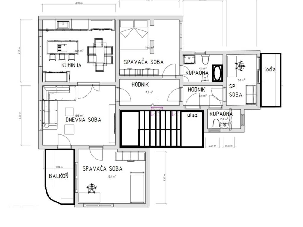 Dodatno stanu prema etažiranju pripada krovna terasa (17,7m2) te podrum veličine 13,8m2 (opremljen strujom i vodom).