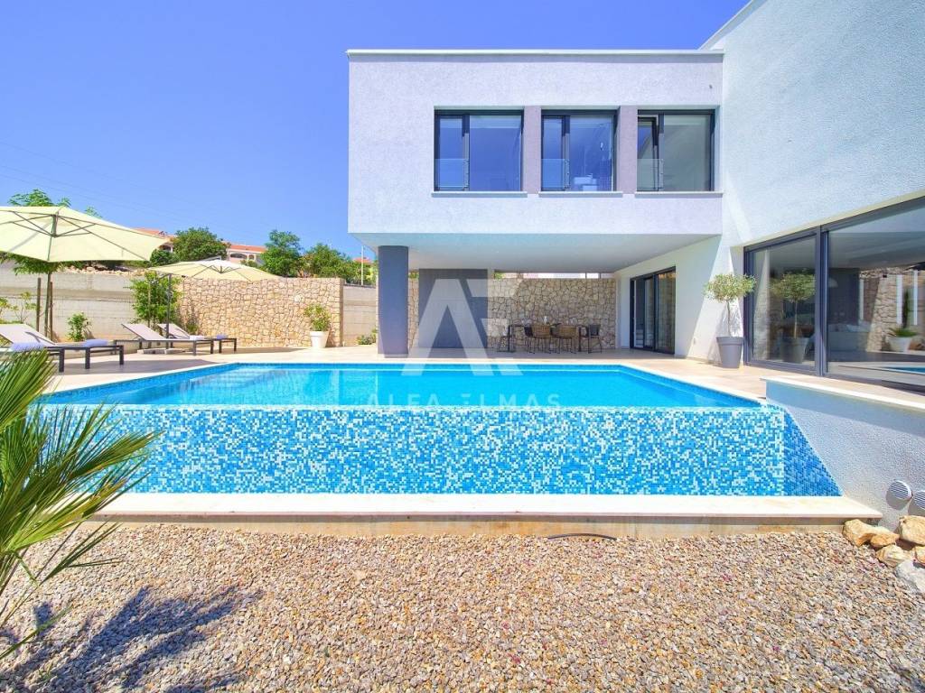 Krk, Umgebung, Luxusvilla mit Pool und Sauna zu verkaufen!! Luxusvilla in der Nähe von Krk mit modernen Elementen, Wohnfläche von 223 m2, auf einem Grundstück von 591 m2 und einem 400 m2 großen Garten, in dem sich ein wunderschöner Überlaufpool von 32 m2 befindet. Die Villa erstreckt sich über drei Etagen. Im Untergeschoss der Villa befindet sich ein Wellnessbereich mit Badezimmer, Heizraum und Abstellraum. Das Erdgeschoss besteht aus einem geräumigen und luftigen Wohnzimmer, einer Küche, einem Esszimmer, einer Toilette und einer Innentreppe, die in den ersten Stock führt, wo sich drei Schlafzimmer mit jeweils eigenem Bad und einer Terrasse mit herrlichem Meerblick befinden. Die Ausstattung der Villa auf Krk umfasst hochwertige Keramik, PVC-Tischlerei, hochwertige Sanitärkeramik, Sat-TV, Klimaanlage in den Zimmern und im Wohnzimmer. Das Grundstück der Villa ist mit mediterranen Pflanzen geschmückt, Parkplatz für zwei Autos. Die Villa befindet sich ca. 3000 m von Krk entfernt, gepflegte Strände und begleitende Annehmlichkeiten. Dokumentation in Ordnung!!
