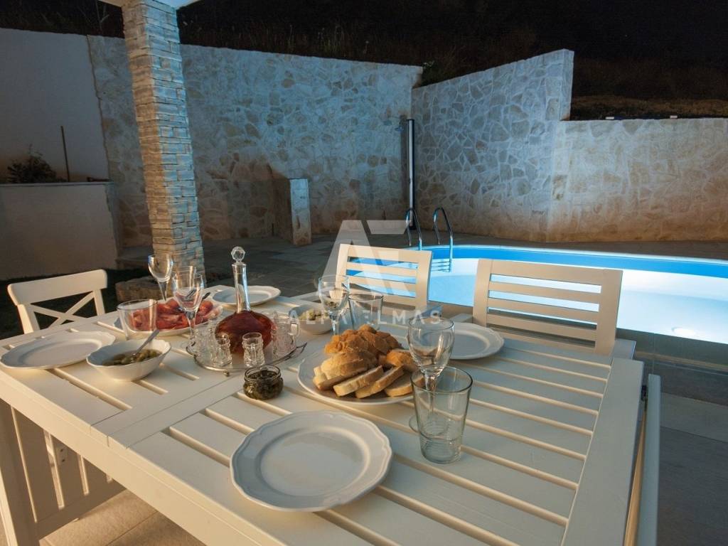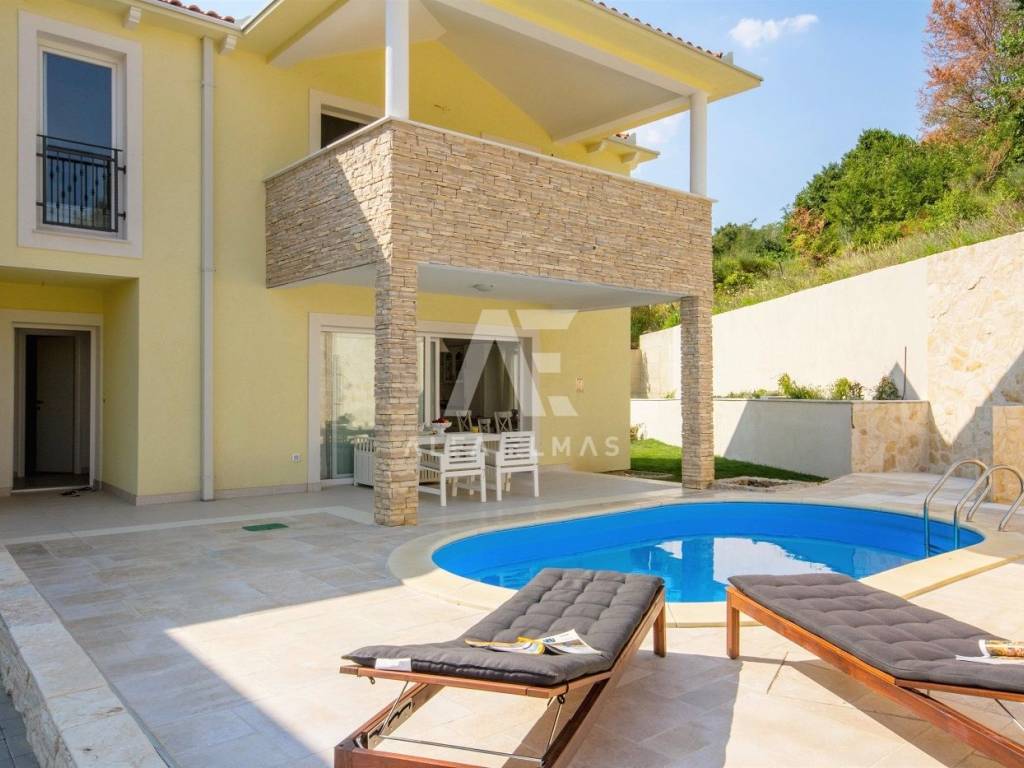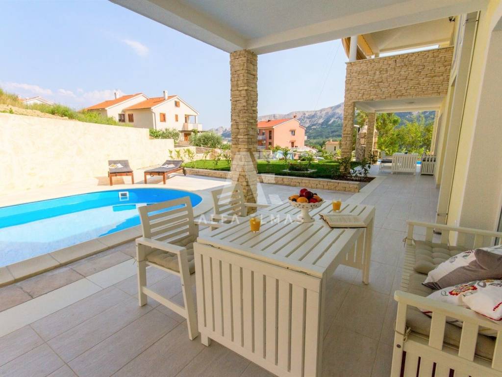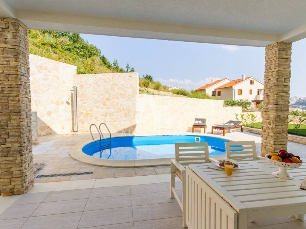 Baška, Umgebung, Doppelhaushälfte mit Swimmingpool und Landschaftsgarten von 170 m2 in ruhiger Lage!! Eine Doppelhaushälfte in der Nähe von Baška, Baujahr 2015, mit einer Wohnfläche von 98 m2, zwei Etagen, Erdgeschoss und erster Stock. Das großzügige Erdgeschoss ist lichtdurchflutet und besteht aus Flur, Gäste-WC, Speisekammer, Küche, Esszimmer und Wohnzimmer mit Zugang zur Terrasse und Garten mit Pool und Sonnendeck. Erdgeschoss und Obergeschoss des Hauses sind durch Innentreppen miteinander verbunden, im Obergeschoss befinden sich drei Schlafzimmer, zwei davon haben Zugang zur Terrasse, die einen wunderbaren Blick auf den Grüngürtel der kleinen Inselstadt bietet, und zwei Badezimmer. Hochwertige Bauweise und Top-Ausstattung. Die Ausstattung eines Doppelhauses in der Nähe von Baška umfasst PVC-Tischlerei, hochwertige Keramik und Sanitärkeramik, Klimaanlage in allen Räumen, Fußbodenheizung im Erdgeschoss und in allen Bädern. SAT-TV. Der Pool verfügt über eine Wärmepumpe zur Erwärmung des Poolwassers. Die Doppelhaushälfte verfügt über einen eingebauten Parkplatz für zwei Fahrzeuge und liegt 1.500 m vom Meer, gepflegten Stränden und dazugehörigen Annehmlichkeiten entfernt. Das Haus wird komplett möbliert verkauft, die Dokumentation ist in Ordnung.