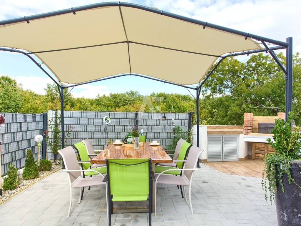 Im Keller befindet sich ein Heizraum zur solaren Warmwasserbereitung. Die Wohnung ist komplett möbliert und ausgestattet, die Bodenbeläge sind aus hochwertiger Keramik, Fenster aus PVC-Tischlerei, Klimaanlage und SAT-TV sind auch vorhanden. Zur Wohung gehören ein Garten mit Pavillon, gemauertem Grill und Außenküche sowie zwei Parkplätze, davon einer überdacht, im angelegten Hof. Die Wohnung bietet eine funktionale und komfortable Aufteilung, ideal für den Tourismus, und zeichnet sich durch ihre ruhige Lage und den Meerblick aus!