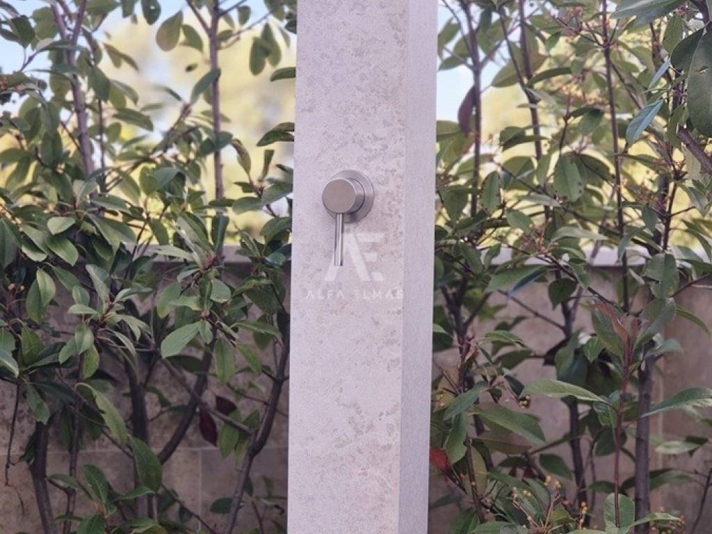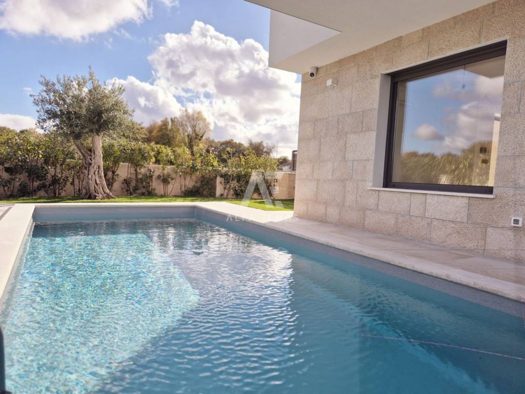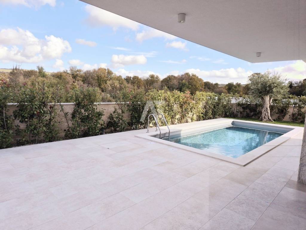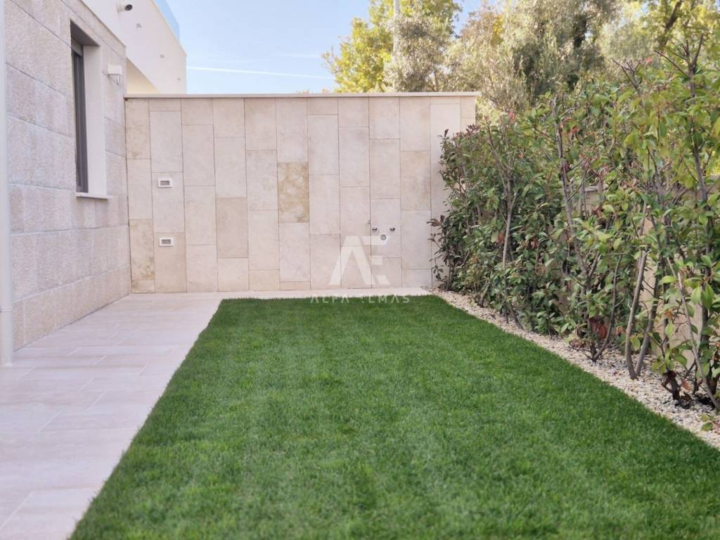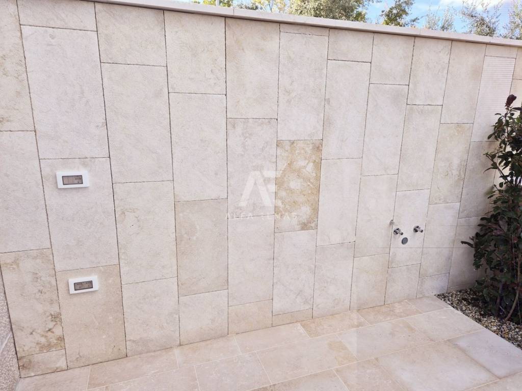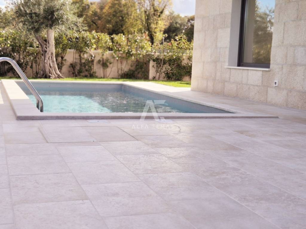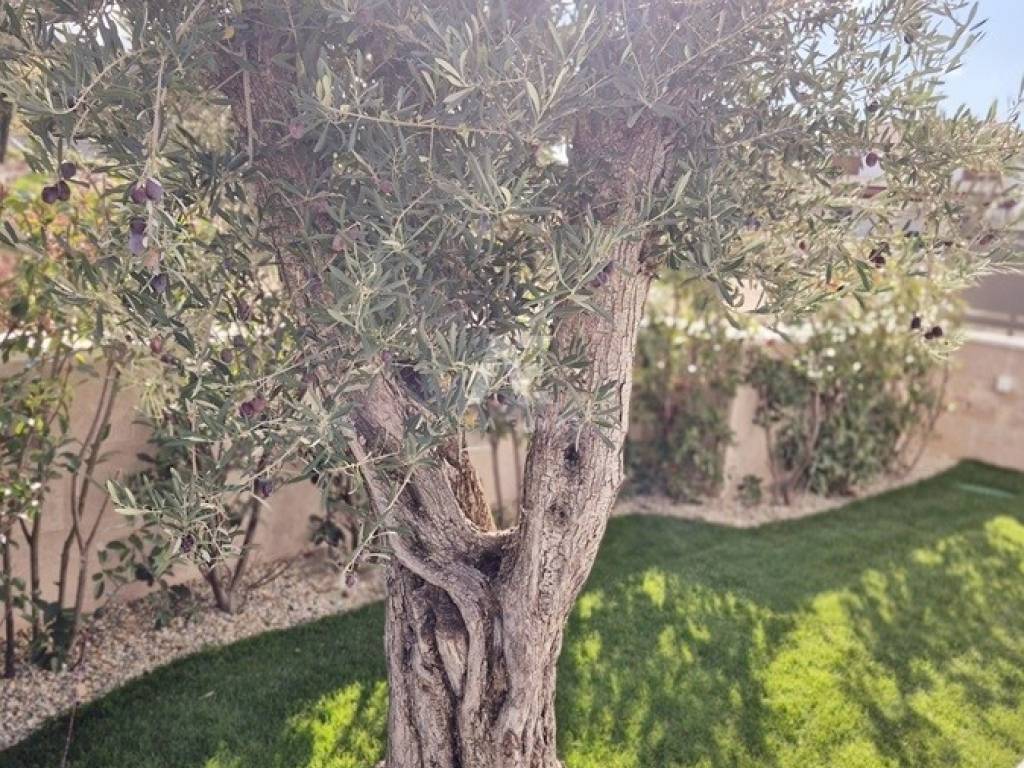 Der Garten verfügt über einen privaten Swimmingpool, ein Sonnendeck und eine Terrasse, ideal zum Entspannen an warmen Tagen. Für eine besondere Atmosphäre sorgen die Steindetails an Fassade und Wänden sowie die sorgfältig angelegte Gartenanlage mit mediterranen Pflanzen und alten Olivenbäumen.