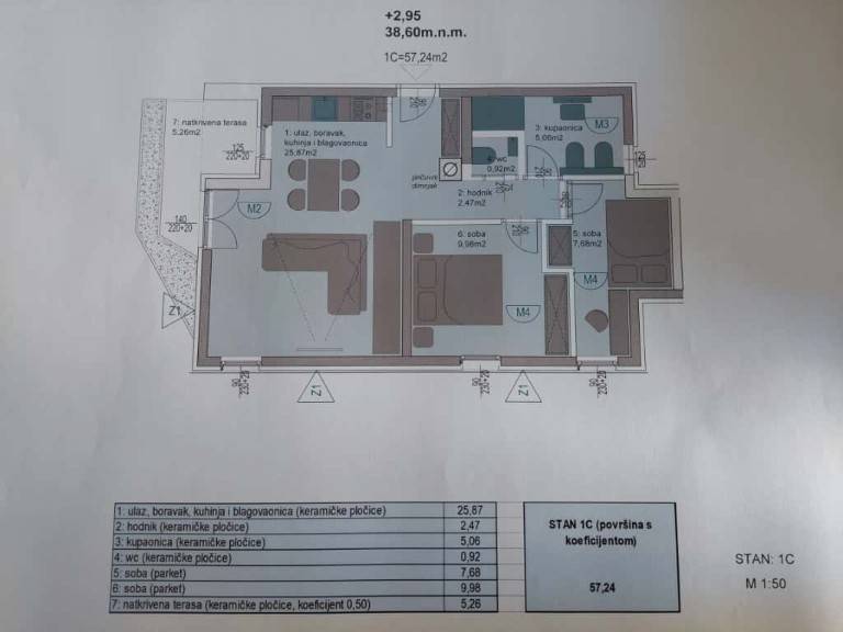 Predstavljamo vam jedinstveni projekt u srcu naselja Kaštanjer u Puli, čija izgradnja uskoro započinje. Ovi vrhunski stanovi predstavljaju idealan spoj kvalitete, udobnosti i atraktivne lokacije, što ih čini savršenim mjestom za život u jednom od najtraženijih dijelova grada.Stan 1C smješten je na prvom katu i prostire se na 57,24 m2. Osmišljen je tako da zadovolji potrebe suvremenog života, s dnevnim boravkom, kuhinjom i blagovaonicom u otvorenom konceptu iz kojih se izlazi na natkrivenu terasu. Stan nudi dvije spavaće sobe, kupaonicu i wc, dok mu dodatnu vrijednost daje parkirno mjesto u podzemnoj garaži površine 13,75 m2.Zgrada se gradi prema visokim standardima, a budući stanari imat će na raspolaganju podzemnu garažu povezanu panoramskim liftom, podno grijanje na vodu koje se zagrijava plinskim bojlerom, klima uređaje te priključak na gradski plin. Sve to jamči maksimalnu udobnost i energetsku učinkovitost.Lokacija je jedan od najvećih aduta ovog projekta. U neposrednoj blizini nalaze se škola, vrtić, bolnica i trgovački centri, a zahvaljujući izvrsnoj prometnoj povezanosti omogućen je brzi izlazak iz grada. Povijesna Arena udaljena je svega 750 metara.Ovaj projekt nudi priliku za sigurno ulaganje i uživanje u modernom stanovanju na odličnoj lokaciji.Za više informacija ili dogovor oko razgleda, slobodno nam se obratite.