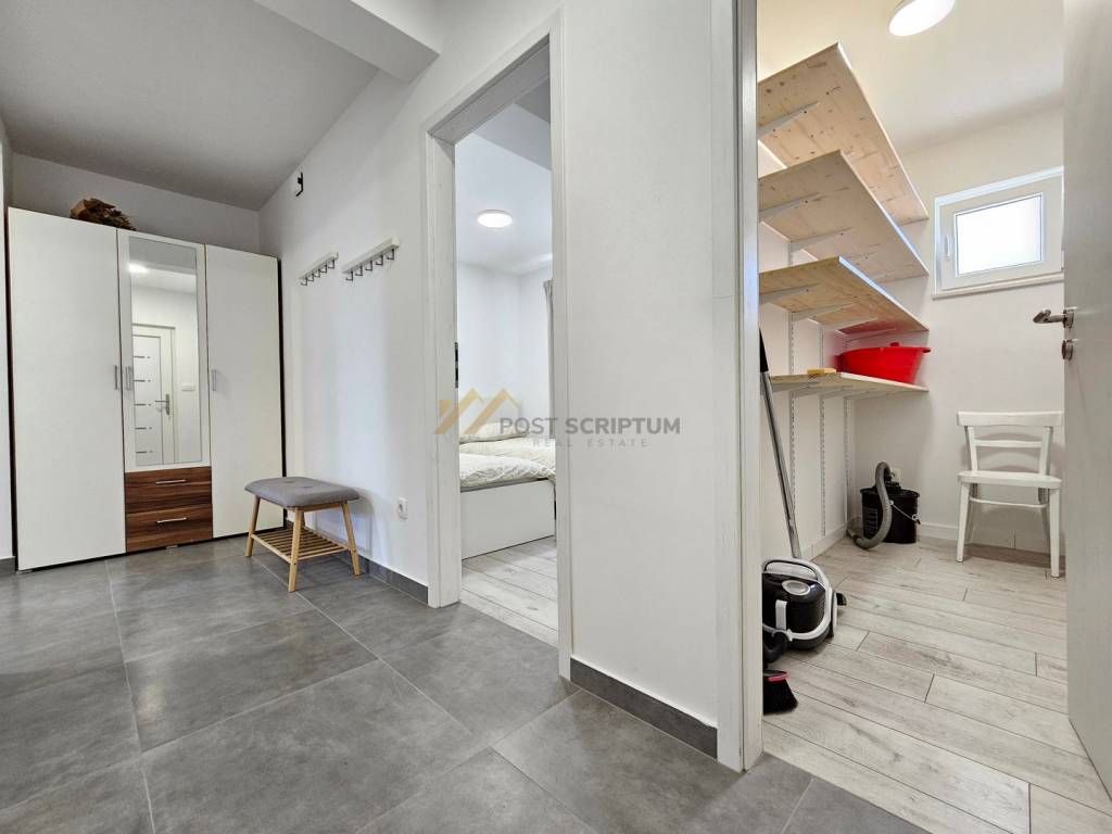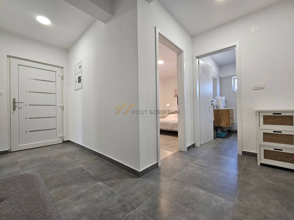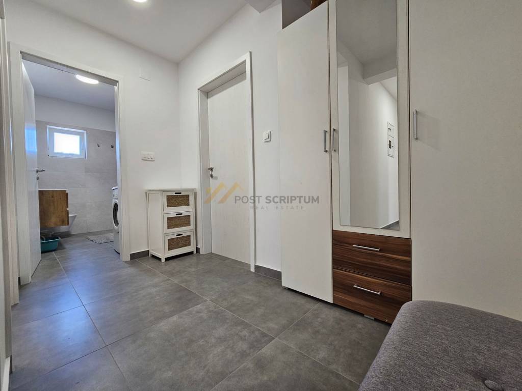 It consists of entrance area, kitchen with dining room and living room, two bedrooms, bathroom, storage room, balcony, terrace that extends along the entire south side and 25sqm lawn.
