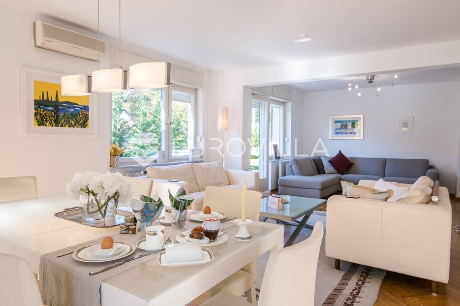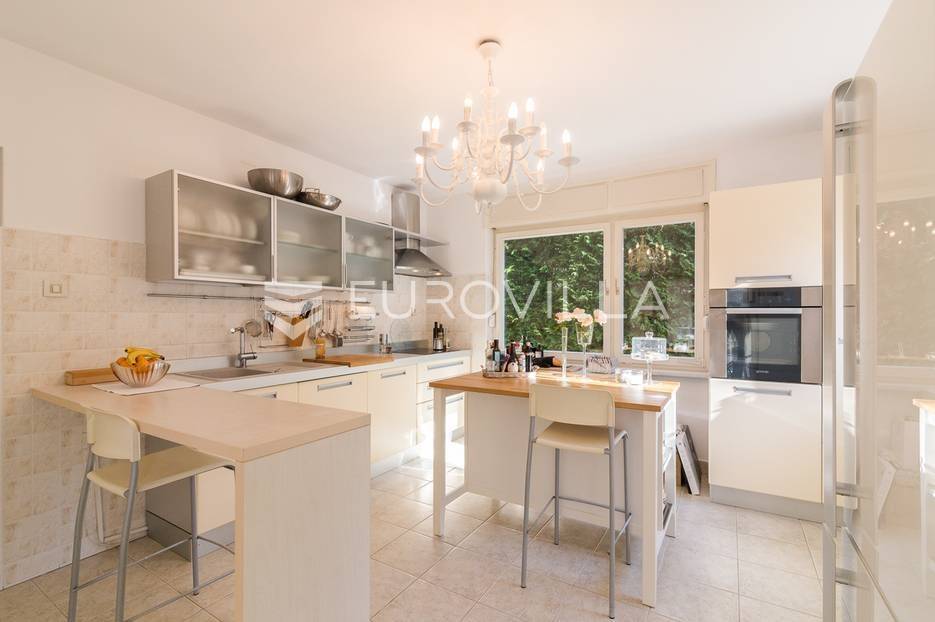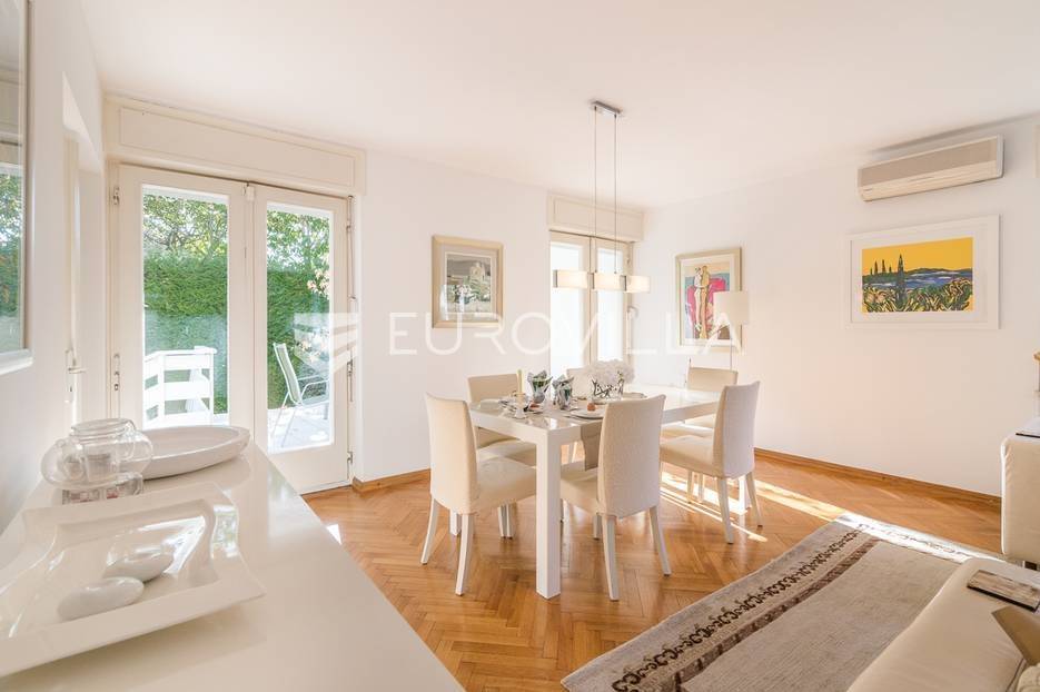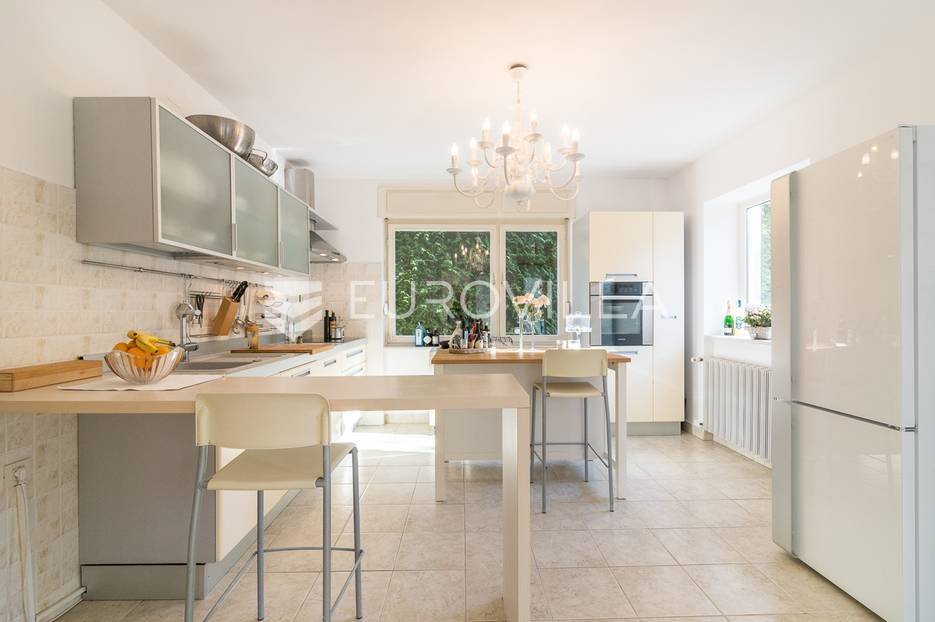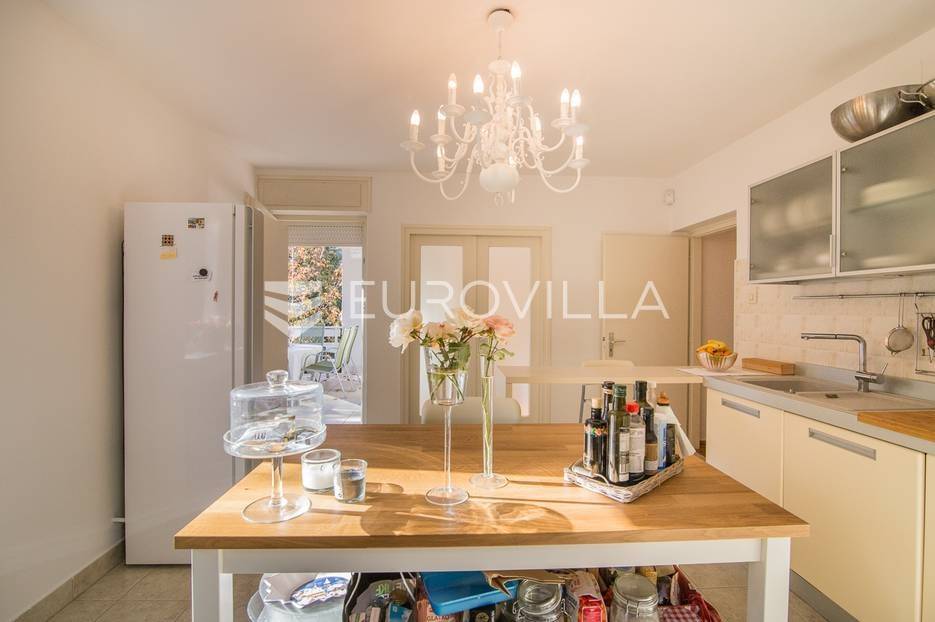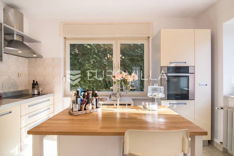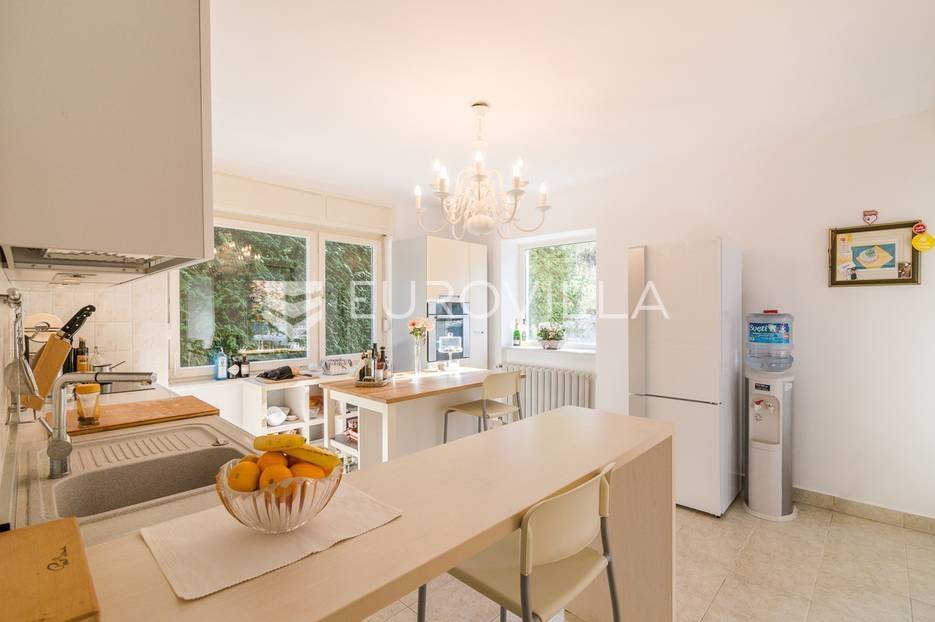 Mlinovi, vrlo ugodna, adaptirana samostojeća kuća s izlazom na prelijepi vrt veličine 500 m2. Kuća se sastoji od:Prizemlje: ulazni hodnik, toalet, dnevni boravak s blagovaonicom, kuhinja, velika terasa, te vrt;Prvi kat: 3 spavaće sobe (svaka s izlazom na balkon), kupaonica;Drugi kat: 2 spavaće sobe, garderoba, kupaonica, 2 balkona;Podrum: vešeraj, garaža za 1 auto, spremište.Ispred kuće se nalazi parking za 2-3 automobila. Kuća je o premljena s 6 klima uređaja, alarmom, portafonom, podnim grijanjem u kupaonici i kuhinji, roštilj, automatskim garažnim vratima, automatskim navodnjavanjem vrta i slično. Ostale infromacije na upit.