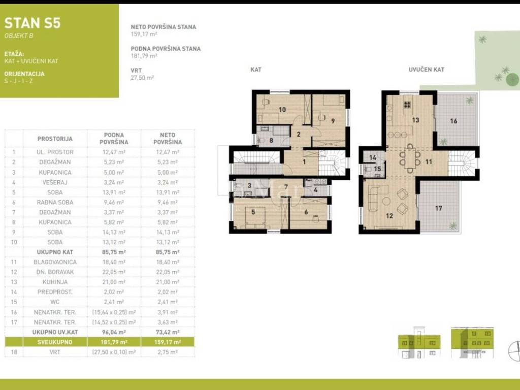Dvoetažni stan, koji se sastoji od ulaza iz prizemlja, I. kata gdje su smještene sekcijski odvojene ukupno četiri spavaće sobe, 2 kupaonice i vešeraj, te na II. katu prostranog dnevnog boravka, kuhinje, blagovaone, špajze i wc-a te dvije terase s prekrasnim pogledom na zelenilo.