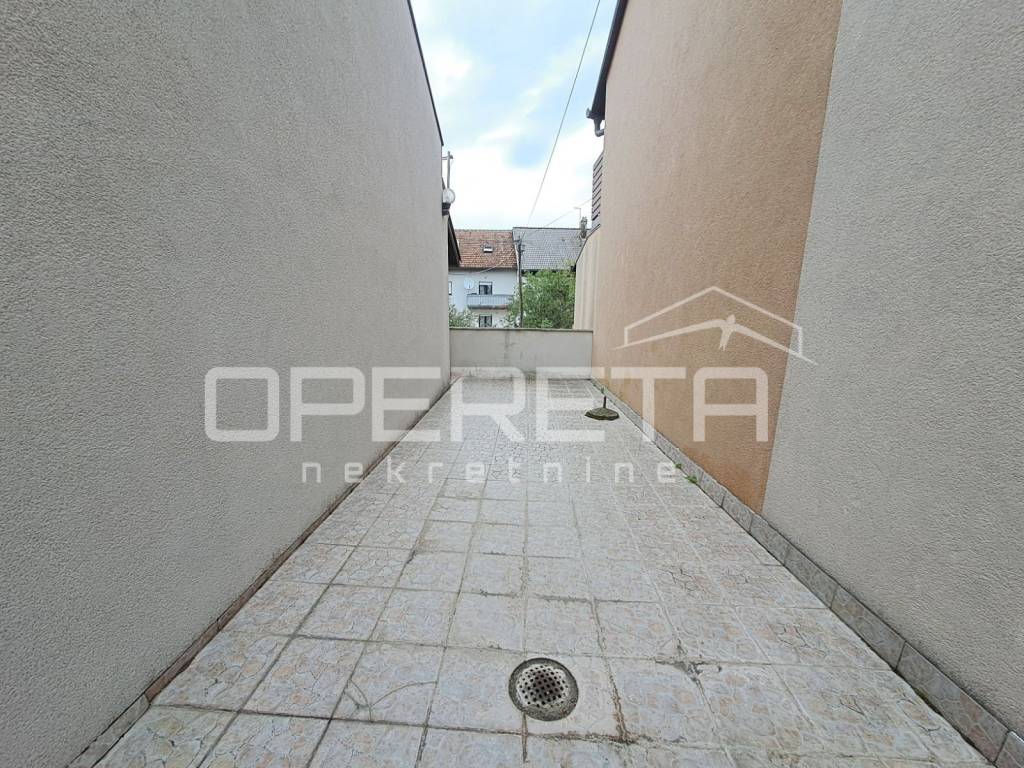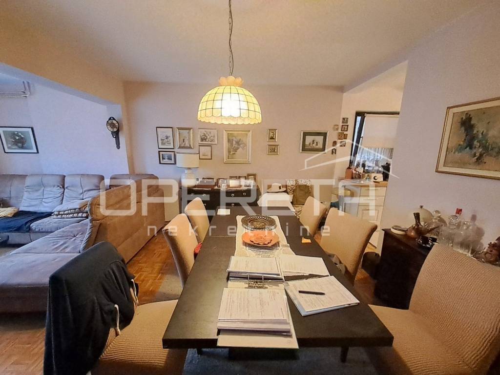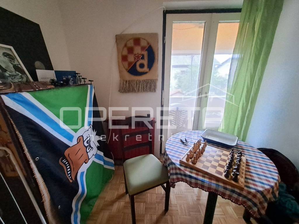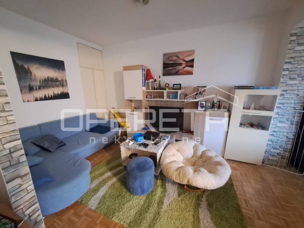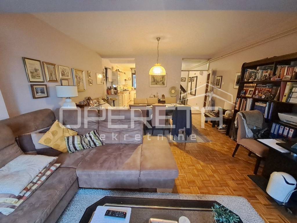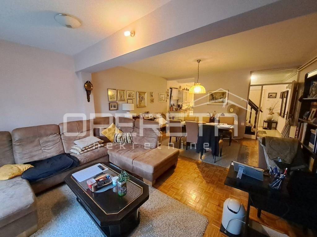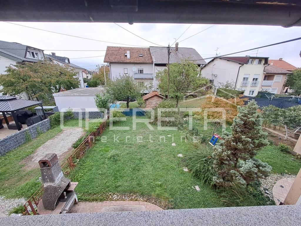 Zanimljiva kuća na odličnoj lokaciji u Velikoj Gorici u neposrednoj blizini osnovne škole, dućana, vrtića..Kuća se jednom stranom dodiruje s drugom, a na drugoj strani je garaža i terasa koja je u doticaju s drugom kućom. Kuća može funkcionirati kao dva odvojena stana ili kao cjelina. Proteže se od prizemlja gdje imamo dnevni boravak, blag+kuhinja, wc, predsoblje, kotlovnicu, spremište ukupno 50m2 NKP +izlaz na vrt od 143m2 preko terase i dvije garaže. Stepenicama se ide na kat gdje je jedna soba i kupaonica s wc-om i izlaz na dvije terase. Sveukupno taj stan ima 70m2. Drugi stan ima zaseban ulaz i sastoji se od dnevnog boravka na 1. katu, a u potkrovlju od sobe, kuhinje i kupaonice s wc-om, sveukupno 50m2. Jedno od većih dvorišta u kvartu s prednje strane prilazom i parkirnim mjestima, a sa stražnje vrlo lijepim vrtom. Iako okruženo kućama, kuća daje privatnost i mir. Preporuke!