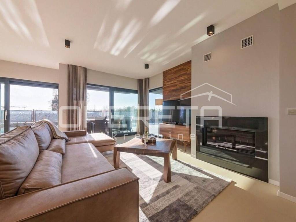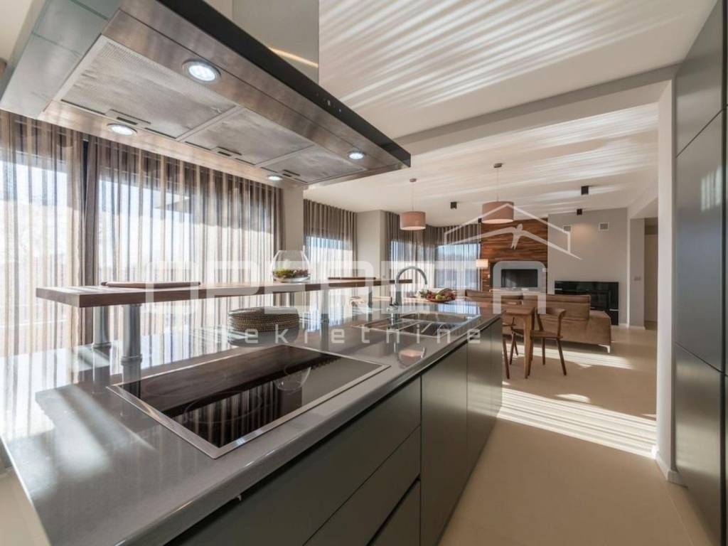 Das Interieur strahlt Großzügigkeit und Helligkeit aus. Das Herzstück des Erdgeschosses bildet ein beeindruckender Open-Space-Bereich, der Wohnzimmer, Essbereich und eine hochwertige Küche mit Kochinsel vereint. Der gesamte Raum ist mit sorgfältig ausgewählten Designermöbeln ausgestattet, während große Glaswände den Blick auf den Pool und die Terrasse freigeben und einen nahtlosen Übergang zwischen Innen- und Außenbereich schaffen. Ein Holzkamin im Erdgeschoss sorgt für zusätzliche Wärme und Atmosphäre, ergänzt durch einen praktischen Abstellraum, eine Garderobe und ein Gäste-WC.