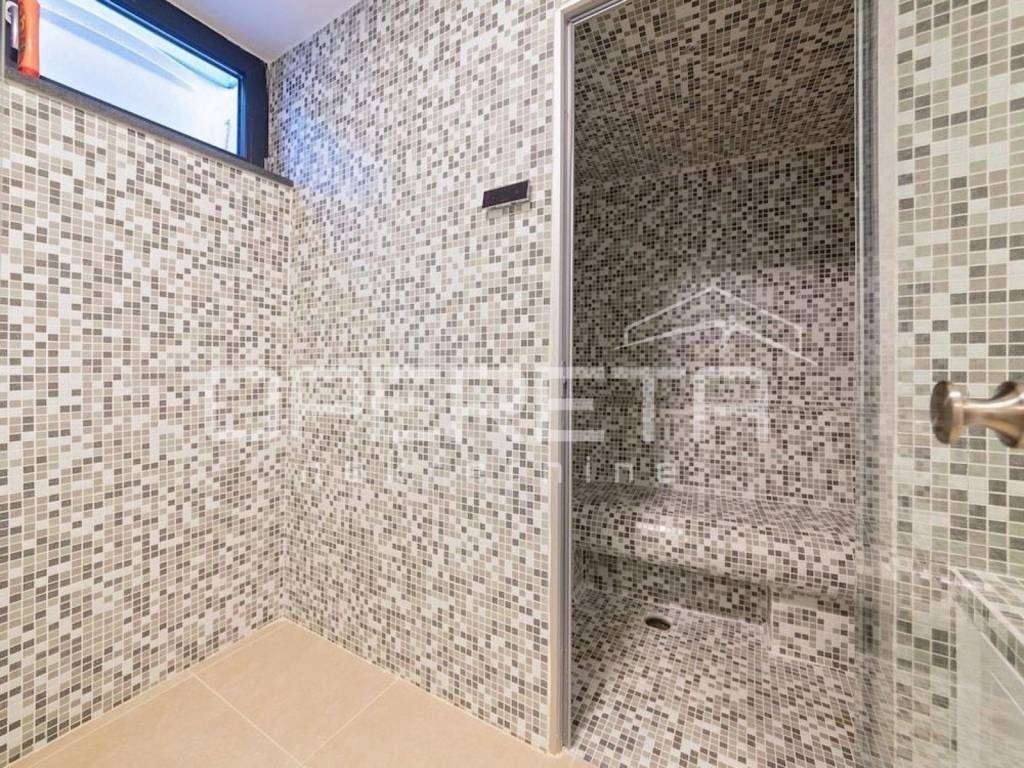 Der private Bereich im Obergeschoss umfasst drei luxuriöse Schlafzimmer, jedes mit eigenem Badezimmer, was den Bewohnern maximalen Komfort und Privatsphäre bietet. Zwei Terrassen auf dieser Etage bieten einen ruhigen Rückzugsort zur Entspannung. Für das vollkommene Wellness-Erlebnis verbirgt die Villa im Untergeschoss eine private Oase, ausgestattet mit Sauna, Dusche und einem voll ausgestatteten Fitnessbereich. Die Krönung des Hauses ist die weitläufige Dachterrasse mit Jacuzzi, von der aus man einen Panoramablick auf das Meer und unvergessliche Sonnenuntergänge genießt.