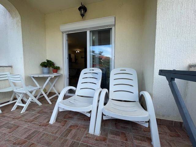 Die Wohnung besteht aus einem Eingangsbereich mit Abstellraum, einer offenen Küche mit Ess- und Wohnzimmer, zwei Schlafzimmern, einem Badezimmer mit Toilette und einer großzügigen Terrasse mit Meerblick. Der Blick aufs Meer ist auch aus einem der Schlafzimmer zu genießen.