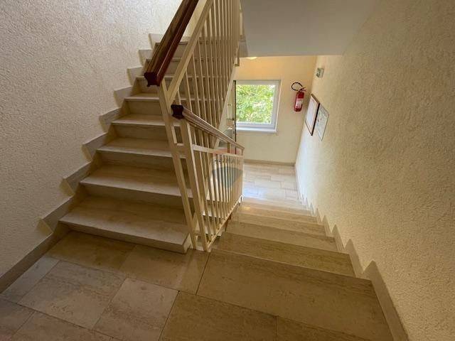 Sie liegt im ersten Stock eines kleineren Wohngebäudes mit insgesamt sechs Wohnungen und ist nach Süden und Westen ausgerichtet, wodurch sie den ganzen Tag über viel Sonnenlicht erhält.