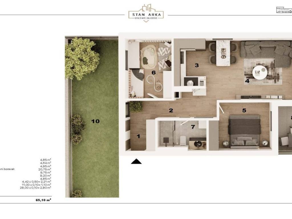 Ukupna površina s parkirnim mjestom i spremištem: 71,10 m²