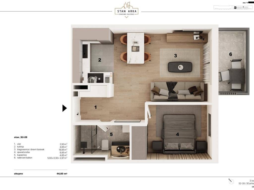 STAN S2-28 - 44,62 m2, 2-sobni, nalazi se na trećem katu (ULAZ 2)