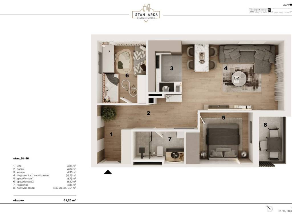 STAN S1-16-61,20 m2, 3-sobni, nalazi se na prvom katu (ULAZ 1)
