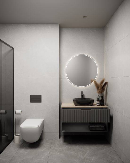 * Potpuno opremeljena kupaonica, walk-in tuš kabina, umivaonik sa slavinom, ormarić i ogledalo