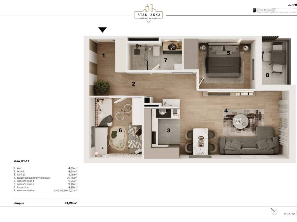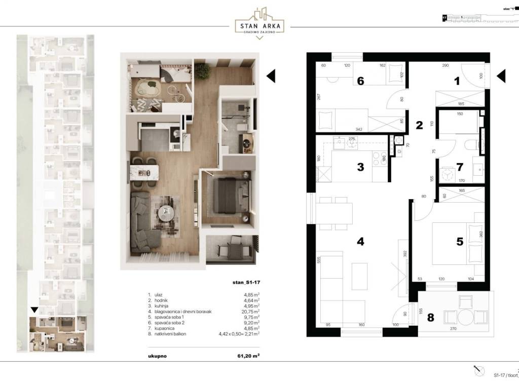 STAN S1-17-61,20 m2, 3-sobni, nalazi se na drugom katu (ULAZ 1)
