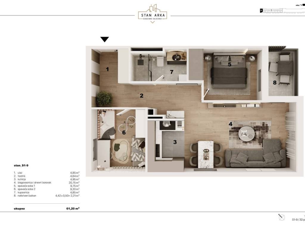 STAN S1-9-61,20 m2, 3-sobni, nalazi se na prvom katu (ULAZ 1)