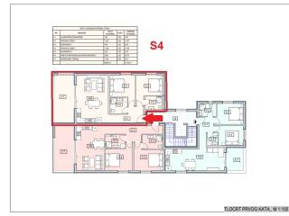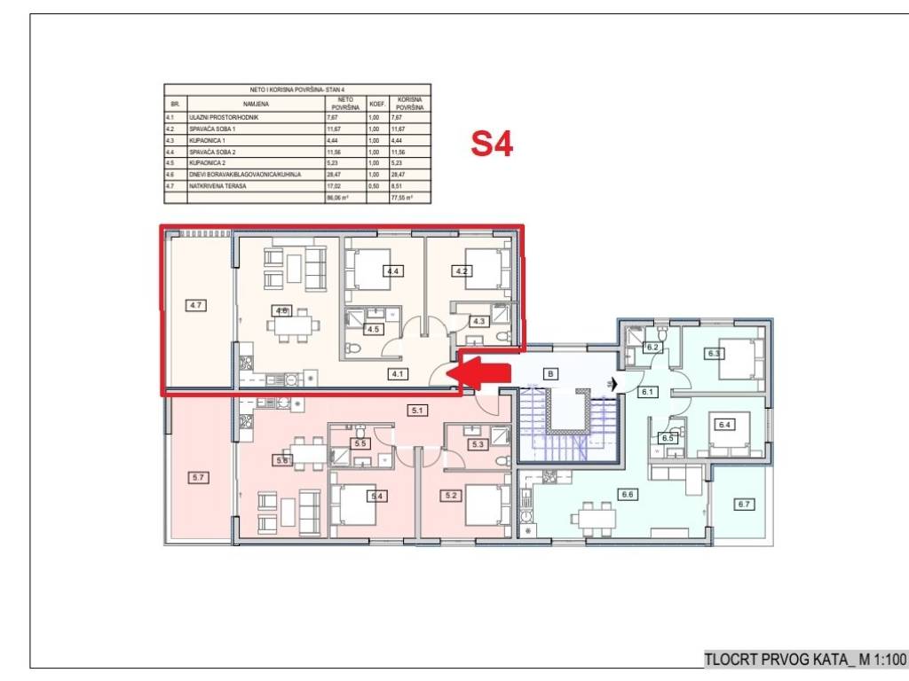 Die Wohnung mit der Bezeichnung TS-S4 befindet sich im ersten Stock eines Gebäudes mit Erdgeschoss und drei weiteren Stockwerken. Insgesamt befinden sich dort acht Wohnungen.