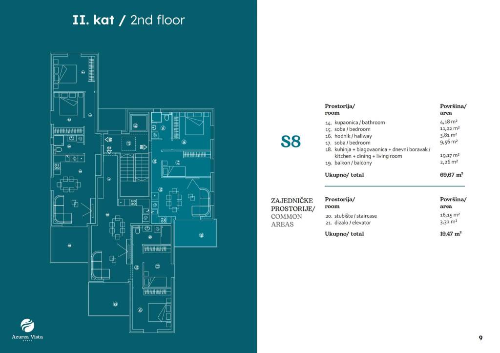 Na prodaju je prekrasan stan na drugom katu luksuzne novogradnje u Trogiru, idealan za život, odmor ili investiciju. Stan površine 65,93 m² nudi funkcionalan i moderan prostor:
