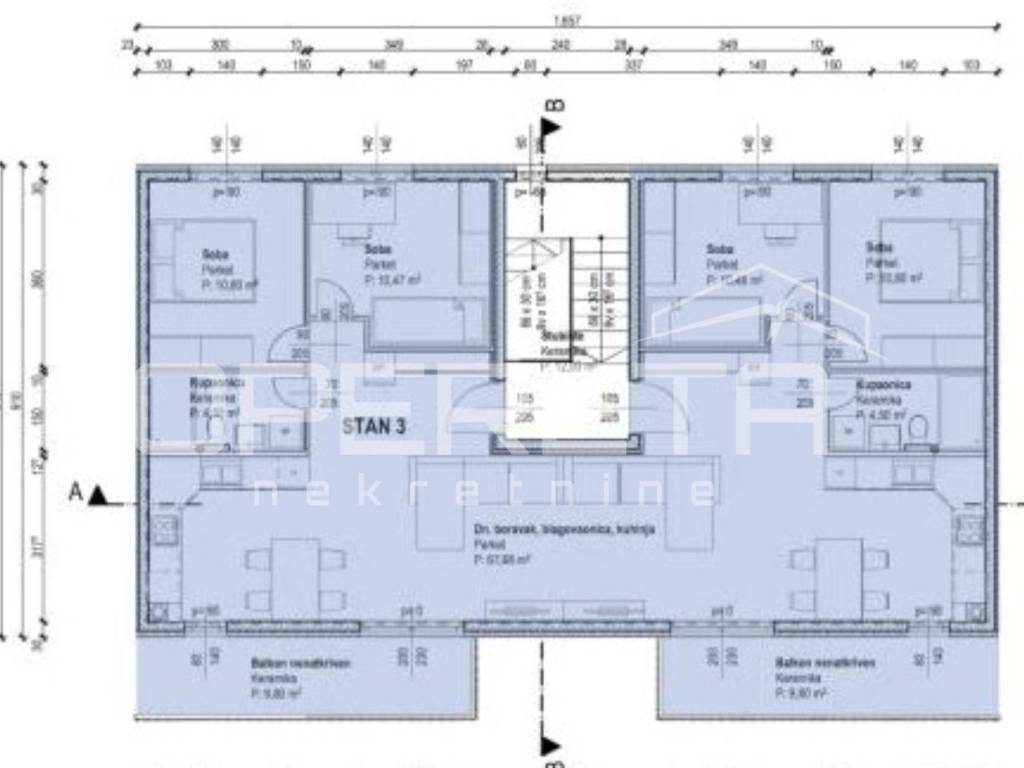 Sastoji se od ulaza, dnevnog boravka, kuhinje, blagovaonice, dvije sobe, kupaonice i balkona.