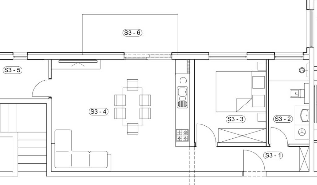 Sastoji se od ulaznog prostora, kupaonice, spremišta, kuhinje, blagovaonice s dnevnim boravkom, spavaće sobe te balkona.