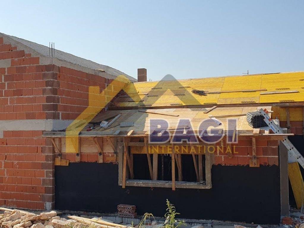- Haus im Rohbauzustand mit installiertem Dach