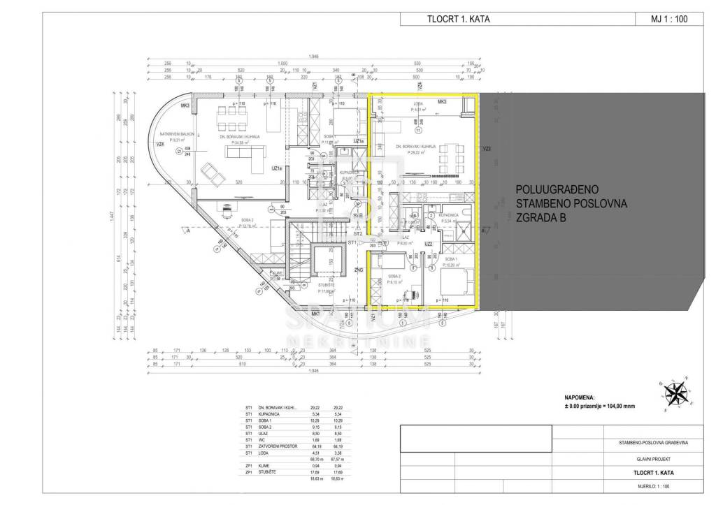 Die Wohnung verfügt über eine Gesamtfläche von 68,70 m², entsprechend 67,57 m² berechneter Nutzfläche, und besteht aus einem großzügigen Wohnbereich mit Küche und Esszimmer, zwei Schlafzimmern, einem Badezimmer, einem separaten WC, einem Eingangsbereich sowie einer 4,51 m² großen Loggia, die den Wohnraum zusätzlich bereichert und die Möglichkeit zum Entspannen im Freien bietet.