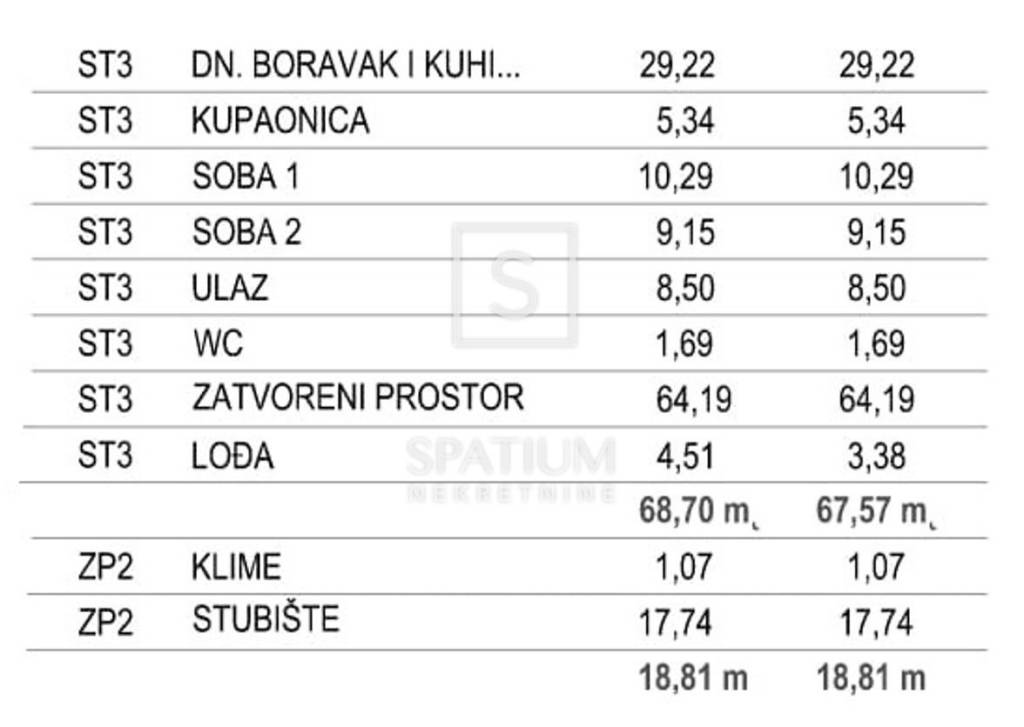 Die Wohnung verfügt über eine Gesamtfläche von 68,70 m², entsprechend 67,57 m² berechneter Nutzfläche, und besteht aus einem großzügigen Wohnbereich mit Küche und Esszimmer, zwei Schlafzimmern, einem Badezimmer, einem separaten WC, einem Eingangsbereich sowie einer 4,51 m² großen Loggia, die den Wohnraum zusätzlich bereichert und die Möglichkeit zum Entspannen im Freien bietet.