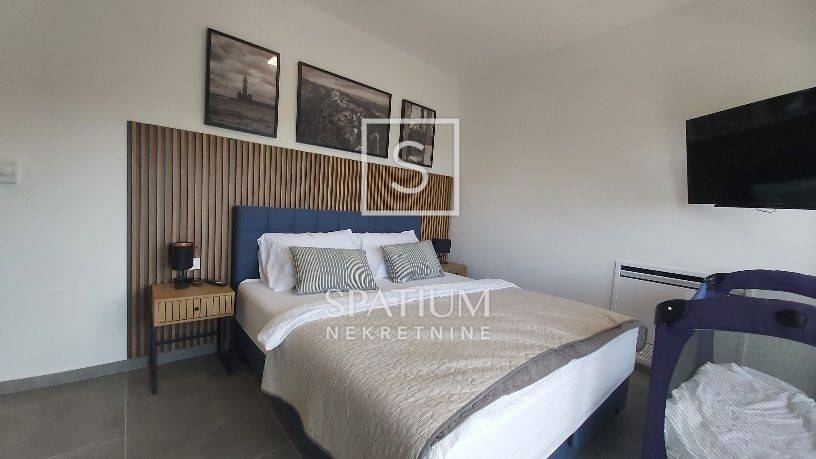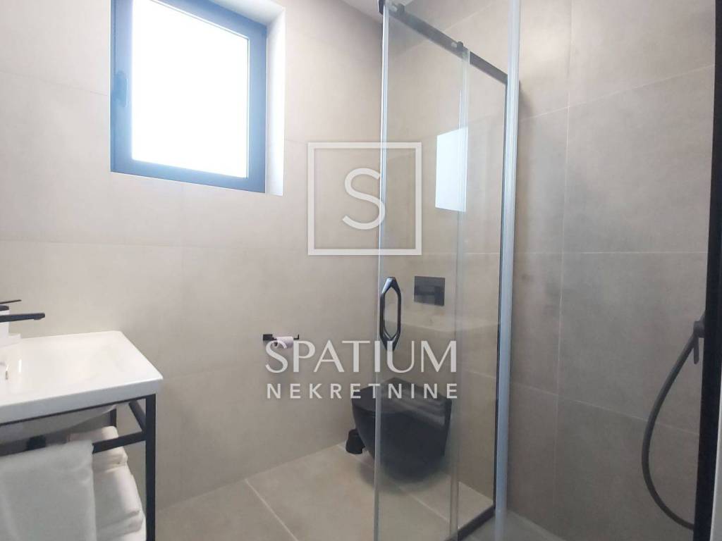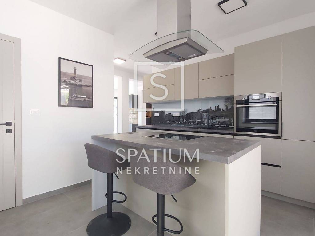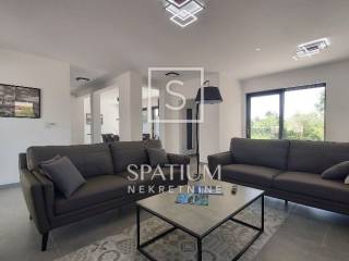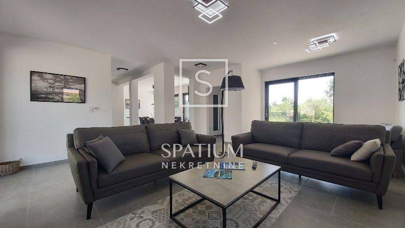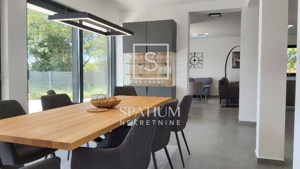 SVETVINČENAT, zum Verkauf steht eine moderne, freistehende Villa mit einer Wohnfläche von 190 m², gelegen in einer ruhigen Siedlung nahe dem historischen Ort Svetvinčenat. Die Villa wurde 2023 auf einem 714 m² großen Grundstück erbaut und zeichnet sich durch moderne Architektur, hochwertige Materialien und ein durchdachtes Raumkonzept aus. Im Erdgeschoss befinden sich ein großzügiges Wohnzimmer, ein Essbereich, eine Küche mit Zugang zur überdachten Terrasse, die für eine Sommerküche vorgesehen ist, ein Abstellraum und ein Gäste-WC. Im Obergeschoss befinden sich vier luxuriöse Schlafzimmer, jeweils mit eigenem Bad und begehbarem Kleiderschrank. Drei Schlafzimmer verfügen über einen Zugang zur Terrasse mit Panoramablick ins Grüne und teilweise aufs Meer. Die Villa ist vollständig möbliert und ausgestattet mit Aluminiumfenstern und elektrischen Rollläden, Fußbodenheizung mittels Wärmepumpe, Gebläsekonvektoren in allen Räumen sowie einem gepflegten Garten mit Pool, Sonnenterrasse und drei Parkplätzen.