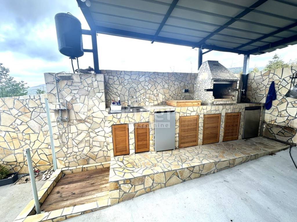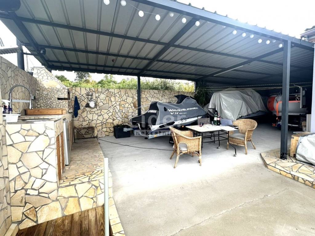 Hinter dem Haus gibt es eine große überdachte Garage (offene Garage) und einen möblierten Grillplatz.