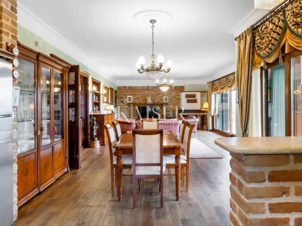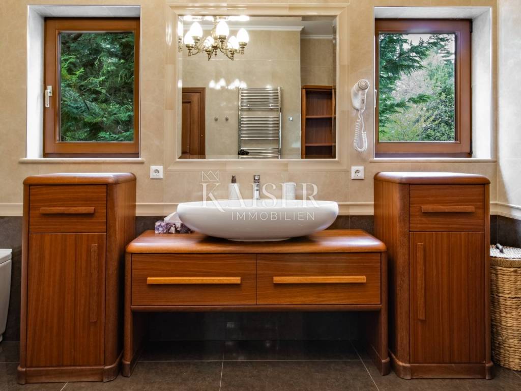 Unterhalb der Hänge des Učka gora, umgeben vom Naturpark Lisinska šuma, auf mehreren Naturterrassen mit Blick Richtung Meer, liegt das Villenanwesen, das Ihnen Kaiser-immobilien Opatija präsentiert. Eine luxuriös eingerichtete Villa auf drei Etagen mit einer Garage, einem Swimmingpool, zwei großen Außengrills, geschützt durch eine natürliche Hecke und die natürliche Neigung des Geländes auf einer Fläche von 1400 m2, bietet Komfort, Ruhe und einen freien Blick auf das Meer. Beim Betreten des Erdgeschosses der Villa öffnet sich vor uns ein großer Bereich des Wohnzimmers, des Esszimmers und der Küche, mit einem Ausgang von jedem Zimmer zur Terrasse mit Blick auf das Meer, wo sich ein Außengrill befindet ein großer Tisch für Familien- und andere Zusammenkünfte. Das offene und geräumige Wohnzimmer wird von einem Krokodilledersofa mit Perserteppich dominiert. Auf der gleichen Etage befindet sich ein Hauptschlafzimmer mit Ankleidezimmer und einem dazugehörigen großen Badezimmer. Auf derselben Etage befinden sich zwei weitere Zimmer. Im Obergeschoss befinden sich 4 Schlafzimmer, jeweils mit eigenem Bad, Küche und Wohnzimmer. Alle Zimmer haben Meerblick und Zugang zur Terrasse. Im Untergeschoss gibt es einen großen Raum für geselliges Beisammensein, einen Massageraum, eine finnische Sauna, ein Badezimmer mit Dusche, ein Arbeitszimmer mit Nebenbereich, ein Heimkino, ausgestattet mit hochwertigsten Lautsprechern und Sesseln zum Genießen und Entspannen, sowie einen Raum – einen Weinkeller mit natürlicher Temperatur zum Konservieren von Wein und Speisen. Der Raum ist mit einer Terrasse, einem Außengrill und einem Swimmingpool verbunden. Das Grundstück der Villa ist mit mediterranen Pflanzen und Grünpflanzen veredelt und gepflegt. Die Garage, die sich auf der Höhe des ersten Stockwerks befindet, verfügt über einen Lastenaufzug, mit dem man zum Eingang der Villa hinunterfahren kann. Die Villa zum Genießen und Ausruhen liegt nur 10 Autominuten von Opatija und den ersten Badestränden entfernt. Opatija und Matulji Zentrum zehn Minuten mit dem Auto, Rijeka ca. 30 Minuten, Triest ca. 1 Std., 30 Min., Zagreb ca. 1 Std., 30 Min., Ljubljana ca. 2 Std., Flughafen Krk ca. 50 Min. Für weitere Informationen und eine Besichtigung wenden Sie sich an Ihren Makler: Eli Lovko, Mob: 0916133776; eli@kaiser-immobilien.hr Die Maklerprovision beträgt 3 % + MwSt
