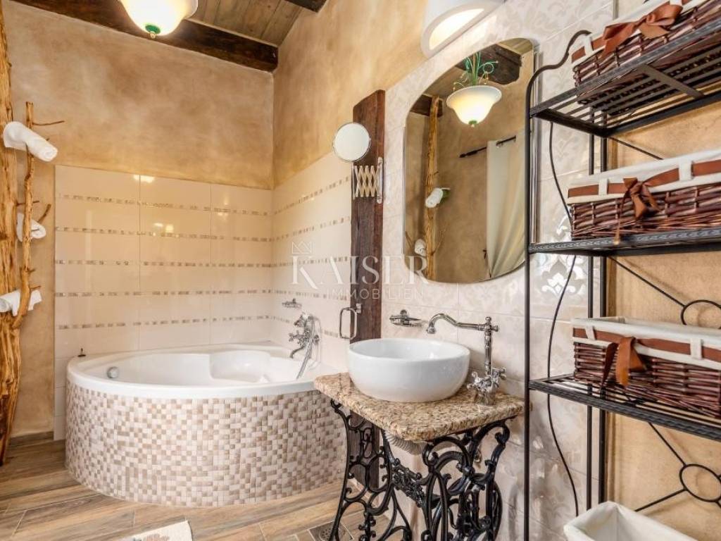 Die Agentur Kaiser Immobilien bietet ein luxuriöses Steinhaus im Vinodolska-Tal in der Stadt Tribalj an, die für ihren See und zahlreiche Paragliding-Gebiete bekannt ist. Die Nähe zu Crikvenica, seinen wunderschönen Stränden und dem Meer platziert Tribalj auf unserer touristischen Landkarte und die ruhige Umgebung und unberührte Natur machen es noch attraktiver für einen ruhigen Urlaub abseits vom Lärm und den Menschenmassen der Stadt. Das Haus wurde bereits im Jahr 1900 erbaut und im Jahr 2018 vollständig renoviert. Es befindet sich auf einem Grundstück von insgesamt 330 m2, wovon das Haus 240 m2 wunderschön und harmonisch gestaltete Fläche einnimmt und der Garten mit einem 25 m2 großen Swimmingpool 100 m2 groß und vor unerwünschten Blicken geschützt ist. Im Erdgeschoss befindet sich eine traditionell eingerichtete Taverne mit vielen Stein- und Holzdetails sowie die Inneneinrichtung des gesamten Hauses und eine Wellness-Oase mit Whirlpool. Der Innenbereich des Hauses besteht aus einem Wohn- und Esszimmer mit einem eleganten rustikalen Kamin, einer ausgestatteten und funktionalen Küche, einer Toilette, vier Schlafzimmern mit Badezimmern, von denen einige Zugang zu einem Balkon und einer Terrasse haben. Das Erdgeschoss und der erste Stock sind durch eine markante Innentreppe verbunden. Ein geräumiger, gemütlicher Garten mit Pool, Terrasse und Kamin verleiht dieser rustikalen Villa einen Hauch von Luxus und eine Kombination aus modernem Komfort und traditionellem Charme. Das Haus verfügt außerdem über Parkplätze für mehrere Fahrzeuge, was ihm heutzutage einen großen Komfort verleiht. Das Haus ist klimatisiert, verfügt über die Möglichkeit, mit Strom und Holz zu heizen und ist mit Solarzellen ausgestattet, was es energieeffizienter macht. Der schnelle Zugang zu wichtigen Annehmlichkeiten und die gute Verkehrsanbindung machen dieses Haus zu einer idealen Investition sowohl für touristische Zwecke als auch für das ruhige Alltagsleben. Crikvenica, Strand: 6 km Flughafen Rijeka: 19 km Flughafen Zagreb: 171 km Rijeka: 28 km Zagreb: 160 km Ljubljana: 140 km München, Wien: 540 km Die Maklerprovision für den Käufer beträgt 3 % + MwSt. und wird nur beim Verkauf der Immobilie bei Unterzeichnung des ersten Rechtsgeschäfts bezahlt. Für weitere Informationen wenden Sie sich bitte an: Marijana Cuculić Telefon: + 385 98 186 9950 E-Mail: marijana.cuculic@kaiser-immobilien.hr