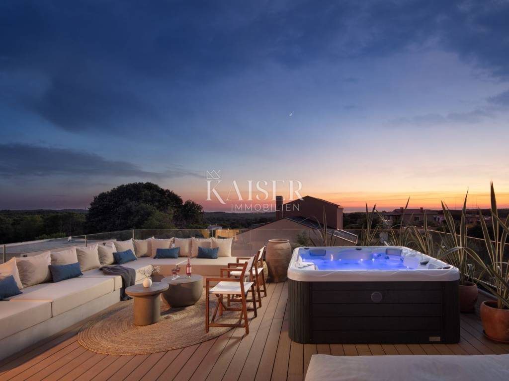 Kaiser Immobilien bietet eine neue und prächtige Villa in wunderschöner, ruhiger Lage, 16 Kilometer von der Stadt Poreč und den ersten Stränden entfernt, zum Verkauf an. Die Villa liegt in einer kleinen ländlichen Gegend Istriens, wo Ruhe und ein entspannter Alltag herrschen. Mit ihrem modernen Design fügt sie sich perfekt in die Nachbarschaft ein und schmückt mit ihrem Erscheinungsbild den Teil der Siedlung, in dem sie sich befindet. Die kleine Stadt Tinjan liegt im westlichen Teil der istrischen Halbinsel, nur 20 km von Poreč entfernt. Eine der bedeutendsten Traditionen dieser Region ist sicherlich das Schmiedehandwerk, zu dessen Ehren traditionell ein Festival abgehalten wird. Tinjan ist berühmt für die istrische Prosciutto-Messe, die jedes Jahr hier stattfindet und bei Einheimischen und Touristen sehr beliebt ist. Die mythischen Landschaften, die mittelalterlichen Städte Zentralistriens, die unberührte Natur und das reiche Erbe wirken fast unwirklich. Unter den Hunderten von Villen, die heute auf dem Markt sind, ist es schwierig, eine Villa zu entwerfen und zu bauen, die völlig anders ist und einen auf den ersten Blick umhaut, und genau das ist den Eigentümern dieser Schönheit gelungen. Mit großem Aufwand und sorgfältiger Auswahl der Materialien und des Designs ist es ihnen gelungen, ein schönes Haus zu schaffen, in dem sich zukünftige Eigentümer wohl und sicher fühlen werden. Jeder Zentimeter des Hauses und des umliegenden Gartens wurde bis ins kleinste Detail sorgfältig gestaltet und dekoriert, was auch auf den Bildern zu sehen ist. Die gesamte Villa ist mit sorgfältig ausgewählten Designermöbeln ausgestattet und wird als solche voll möbliert verkauft. Diese wunderschöne Villa befindet sich auf einem 850 m2 großen Grundstück. Die Villa besteht aus einem Erdgeschoss und einem ersten Stock mit einer Gesamtwohnfläche von 220 m2 und fünf Schlafzimmern. Das Erdgeschoss verfügt über ein großes Wohnzimmer, eine Küche mit Esszimmer, ein Schlafzimmer mit eigenem Bad, eine zusätzliche Gästetoilette und einen Abstellraum. Im Obergeschoss befinden sich vier Schlafzimmer, jedes mit eigenem Bad, und ein Wellnessraum, der zukünftigen Eigentümern ein Gefühl von Entspannung und Luxus vermitteln wird. Auf der Terrasse befindet sich ein Whirlpool, von dem aus Sie einen herrlichen Blick auf das Meer und die Natur genießen. In der gesamten Villa wurde im ersten und zweiten Stock eine Fußbodenheizung mit Wärmepumpensystem zum Heizen im Winter installiert, und die Zimmer sind zusätzlich mit Klimaanlagen ausgestattet. Der Außenbereich umfasst einen großen, beheizten Pool (40 m²), eine Sommerküche zum Grillen und für geselliges Beisammensein, eine Liegewiese und einen Loungebereich. Der sorgfältig angelegte mediterrane Garten verleiht der Villa einen besonderen Reiz und unterstreicht das authentische istrische Ambiente. Diese elegante Designervilla verkörpert die perfekte Kombination aus istrischem Charme, modernem Luxus und höchstem Komfort. Sie befindet sich in ruhiger Lage und ist perfekt in die natürliche Umgebung integriert. Egal, ob Sie ein exklusives Familienhaus suchen oder in eine Immobilie mit hohem Vermietungspotenzial investieren möchten, diese Immobilie bietet alles, was Sie sich wünschen – Ruhe, Privatsphäre, Qualität und Annehmlichkeiten, die kaum jemanden gleichgültig lassen. Die Agenturgebühr beträgt 3 % zuzüglich Mehrwertsteuer und wird mit dem ersten Rechtsgeschäft erhoben. Nähe zu Annehmlichkeiten: Poreč, Zentrum – 16 km Restaurant – 500 m Café – 500 m Geschäft – 4 km Grundschule: 4 km Apotheke: 4 km Strand – 16 km Für weitere Informationen wenden Sie sich an den Makler. Dean Cvitko dean.cvitko@kaiser-immobilien.hr +385 91 5284449