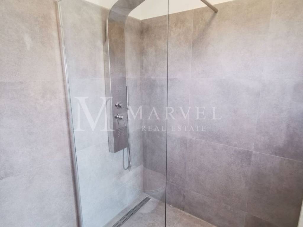Eine Innentreppe führt in den ersten Stock, wo sich zwei Schlafzimmer befinden, jeweils mit eigenem Badezimmer und Balkon. Das Dachgeschoss verfügt über ein weiteres Badezimmer und einen großen Raum, der mit einer Trennwand in zwei kleinere Räume unterteilt werden kann.