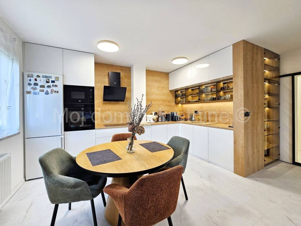 Sastoji se od: - dnevnog boravka - kuhinje s blagovaonom - 3 spavaće sobe - kupaone s wc-om - balkona - spremišta u prizemlju - 2 parkirna mjesta