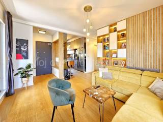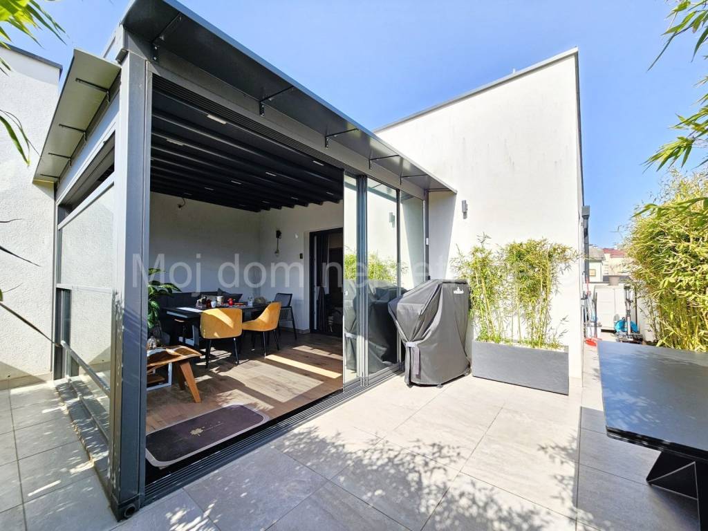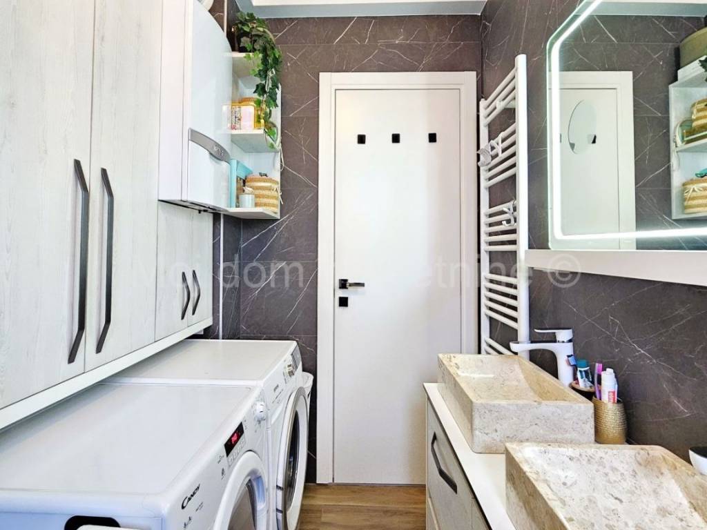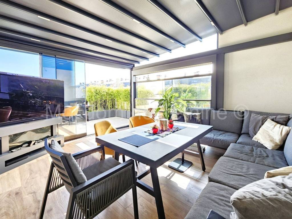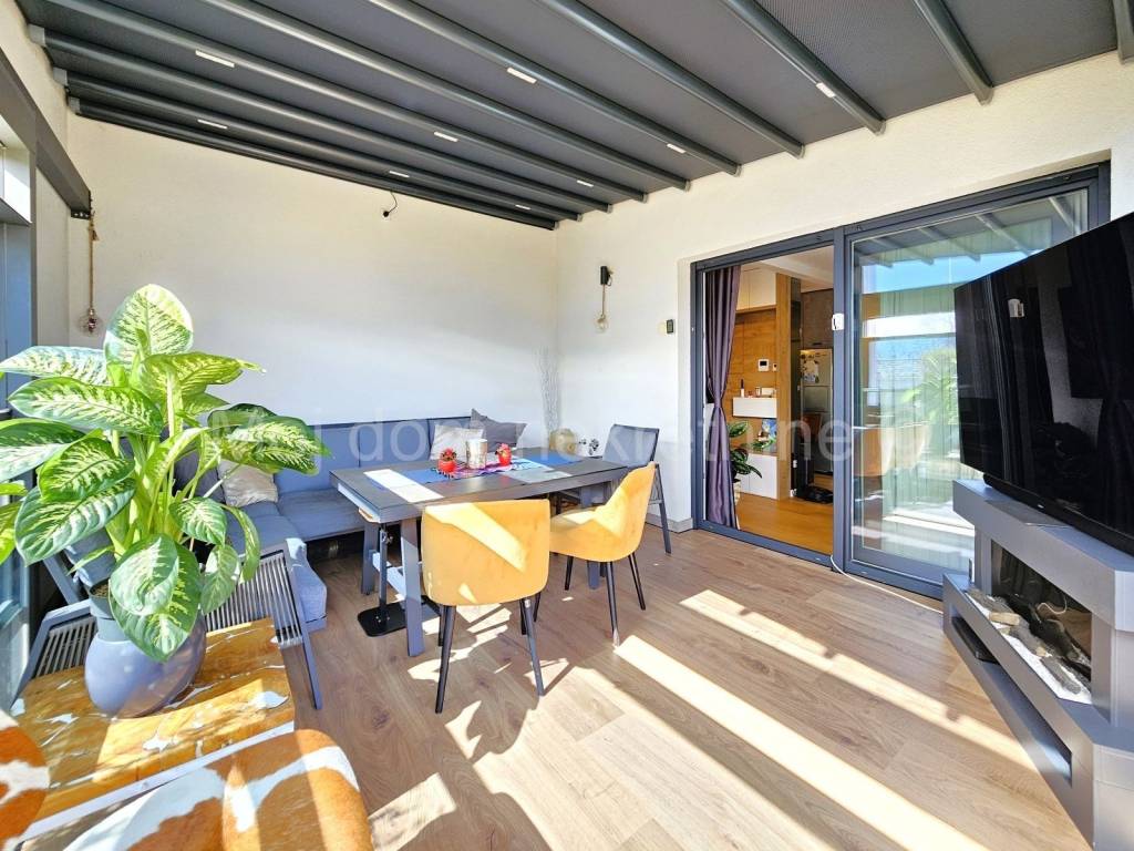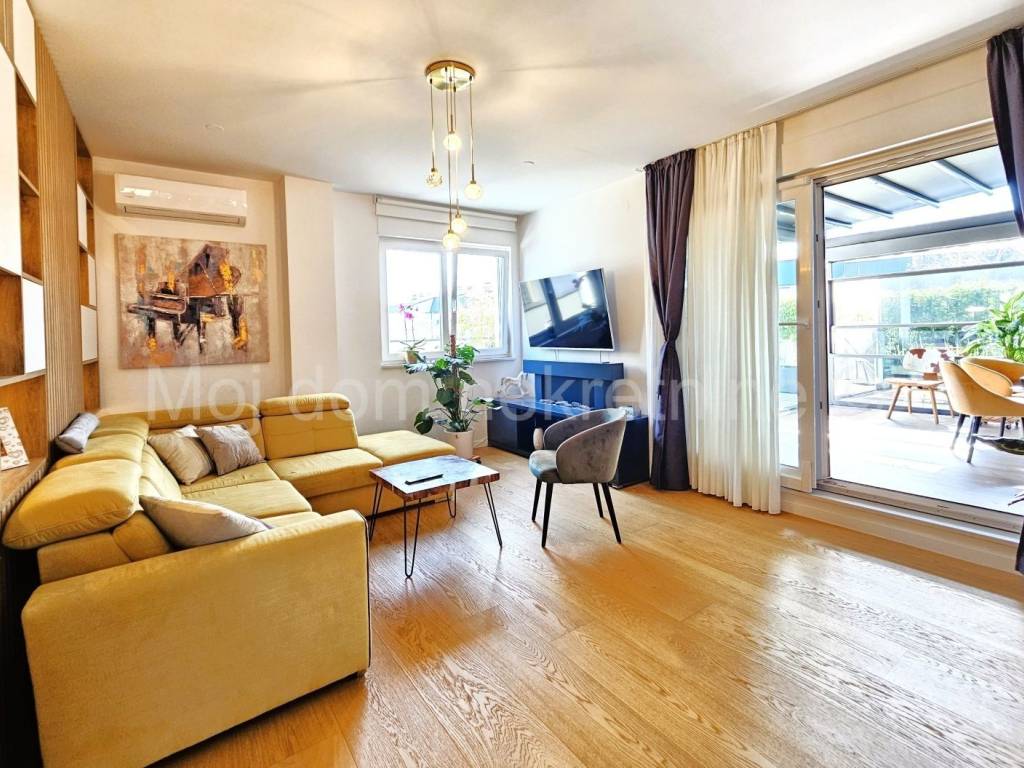 Stan je opremljen PVC stolarijom s troslojnim izo staklom (sa low-e folijama) i ALU električnim roletama, klima uređajem, video portafonom, prvoklasnim talijanskim parketom, dizajnerskom kuhinjom te se prodaje u potpunosti namješten. Dio terase ostakljen i opremljen najskupljom vrstom parketa pogodnim za podno grijanje. Staklene stijene i krov spojeni su na motor te se prema potrebi mogu otvarai/zatvarati.