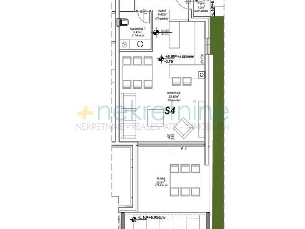 LUKSUZNI DVOSOBNI STAN U PRIZEMLJU PRIVLAKA, DRUGI RED OD MORA Prodaje se prostrani dvosobni stan (S4) u prizemlju novogradnje u Privlaci, u neposrednoj blizini Zadra. Ukupna površina stana s pripadcima iznosi 88,43 m. Stan se nalazi u zgradi s 10 stambenih jedinica, smještenoj drugi red od mora. Prilaz zgradi je privatan, ograđen i osiguran sustavom pristupa putem šifre ili kartice, što vlasnicima osigurava potpunu privatnost i sigurnost. KARAKTERISTIKE STANA: Ulazni hodnik Prostrani dnevni boravak s kuhinjom i blagovaonicom Dvije spavaće sobe Dva moderna kupatila Garderoba Lođa Predvrt idealan za opuštanje (26,84m2) Vlastito parkirno mjesto na parceli